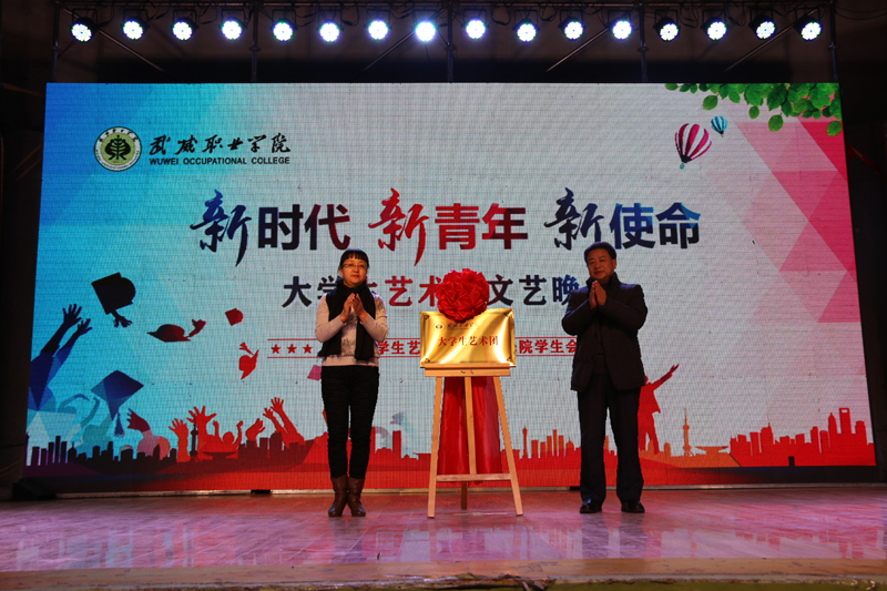 晚會開始前舉行了學院大學生藝術(shù)團成立揭牌儀式,黨委副書記趙明、副院長田迎春上臺為大學生藝術(shù)團揭牌。