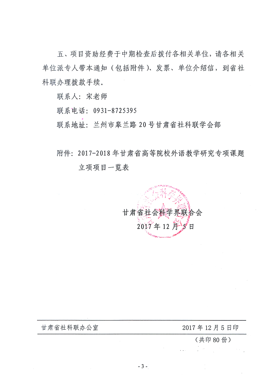 轉(zhuǎn)發(fā)甘肅省社科聯(lián)“關(guān)于2017-2018年甘肅省高等院校外語教學(xué)研究專項課題立項的通知”