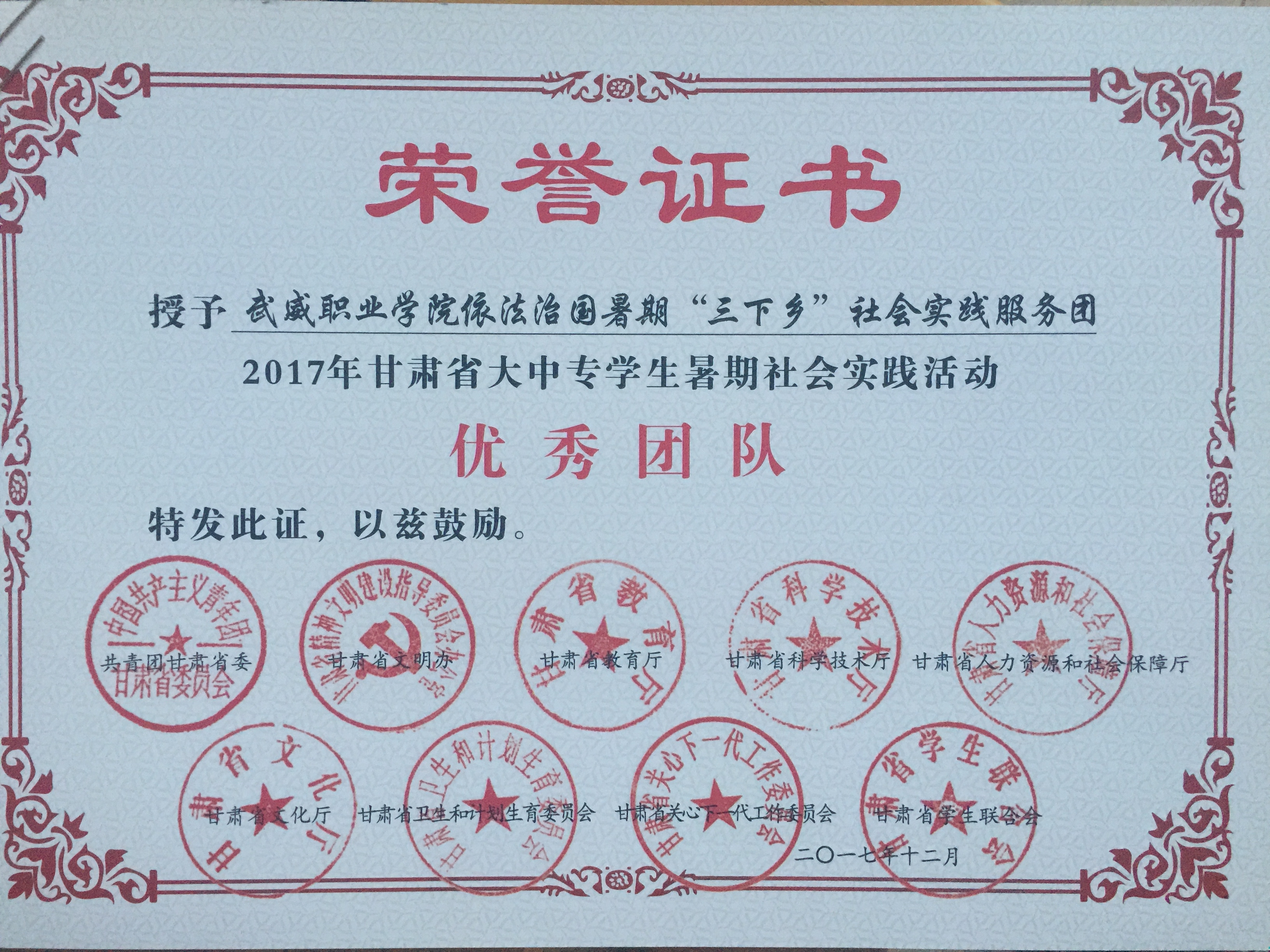 2017年甘肅省大中專學(xué)生暑期社會實踐活動“優(yōu)秀團隊”--依法治國暑期“三下鄉(xiāng)”社會實踐服務(wù)團