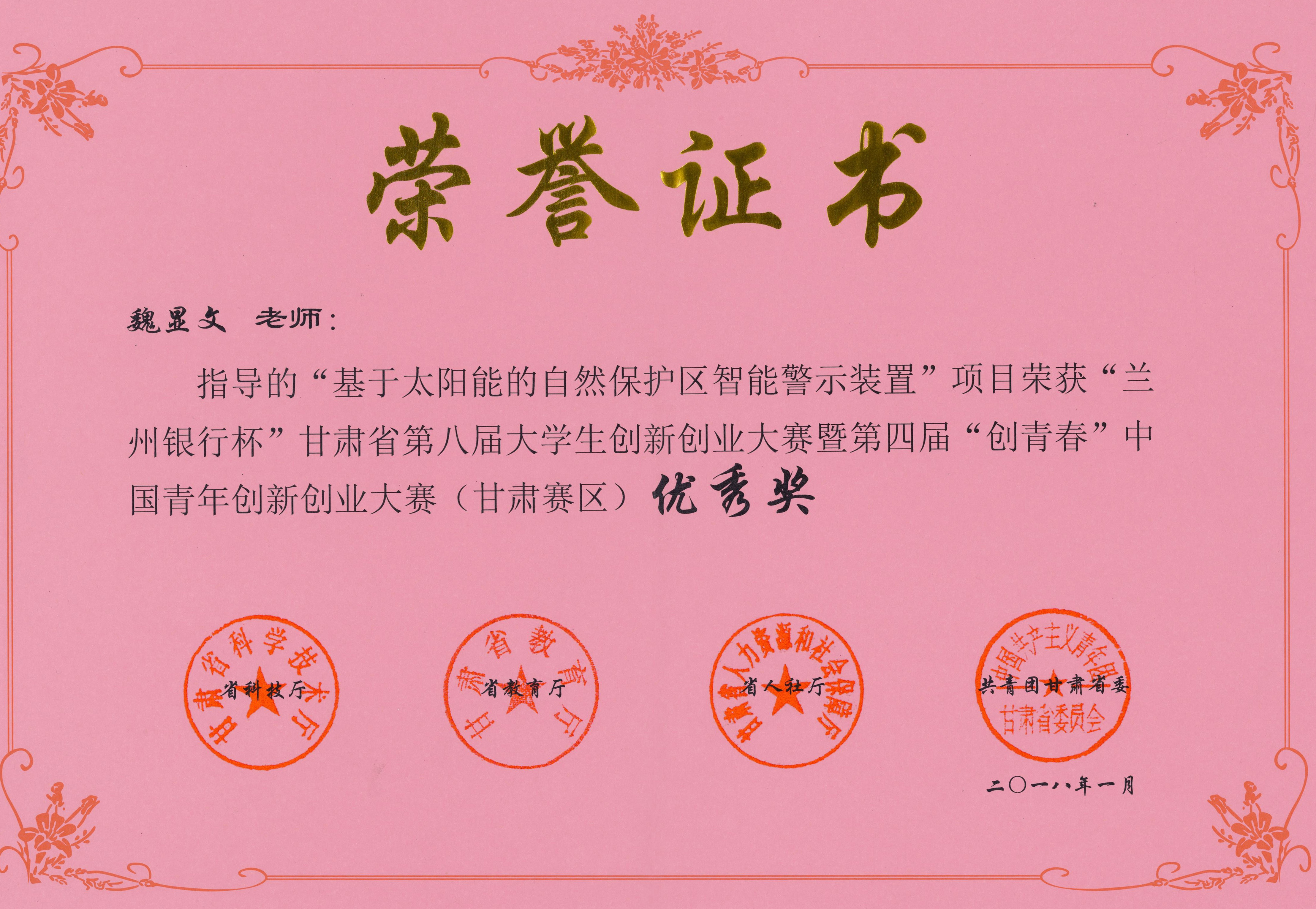 近日,從省教育廳、省科技廳、省人力資源和社會保障廳、共青團甘肅省委聯(lián)合下發(fā)的《關(guān)于公布“蘭州銀行杯”甘肅省第八屆大學生創(chuàng)新創(chuàng)業(yè)大賽暨第四屆“創(chuàng)青春”中國青年創(chuàng)新創(chuàng)業(yè)大賽(甘肅賽區(qū))獲獎名單的通知》中獲知,在今年1月7日舉辦的“蘭州銀行杯”甘肅省第八屆大學生創(chuàng)新創(chuàng)業(yè)大賽暨第四屆“創(chuàng)青春”中國青年創(chuàng)新創(chuàng)業(yè)大賽(甘肅賽區(qū))中,我院選送的“基于太陽能的自然保護區(qū)智能警示裝置”項目獲得優(yōu)秀獎。