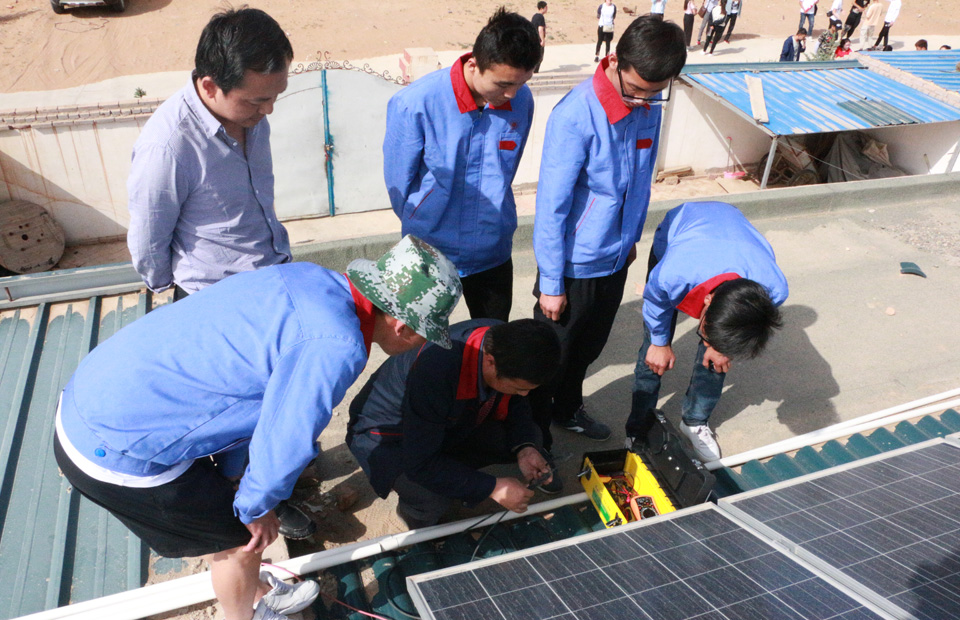 ? ? ?走進(jìn)圓夢新村,由學(xué)院校辦企業(yè)武威泰豐新能源有限公司建設(shè)的200戶貧困家庭戶均3kw的分布式光伏發(fā)電系統(tǒng)映入眼簾。在社區(qū)書記郭林春的帶領(lǐng)下,黨員教師和學(xué)生入黨積極分子上門幫助用戶檢查維修光伏發(fā)電設(shè)備,檢查光伏組件的老化跡象以及所有連接器是否連接緊密、有無腐蝕現(xiàn)象,檢查組件是否接地良好。了解農(nóng)戶的需求,為農(nóng)戶講解光伏設(shè)備后期維護(hù)、電費(fèi)結(jié)算方式以及國家扶貧惠民的政策等知識,并對部分農(nóng)戶屋頂光伏組件故障進(jìn)行了排除,對光伏組件進(jìn)行了大面積清潔維護(hù)。
