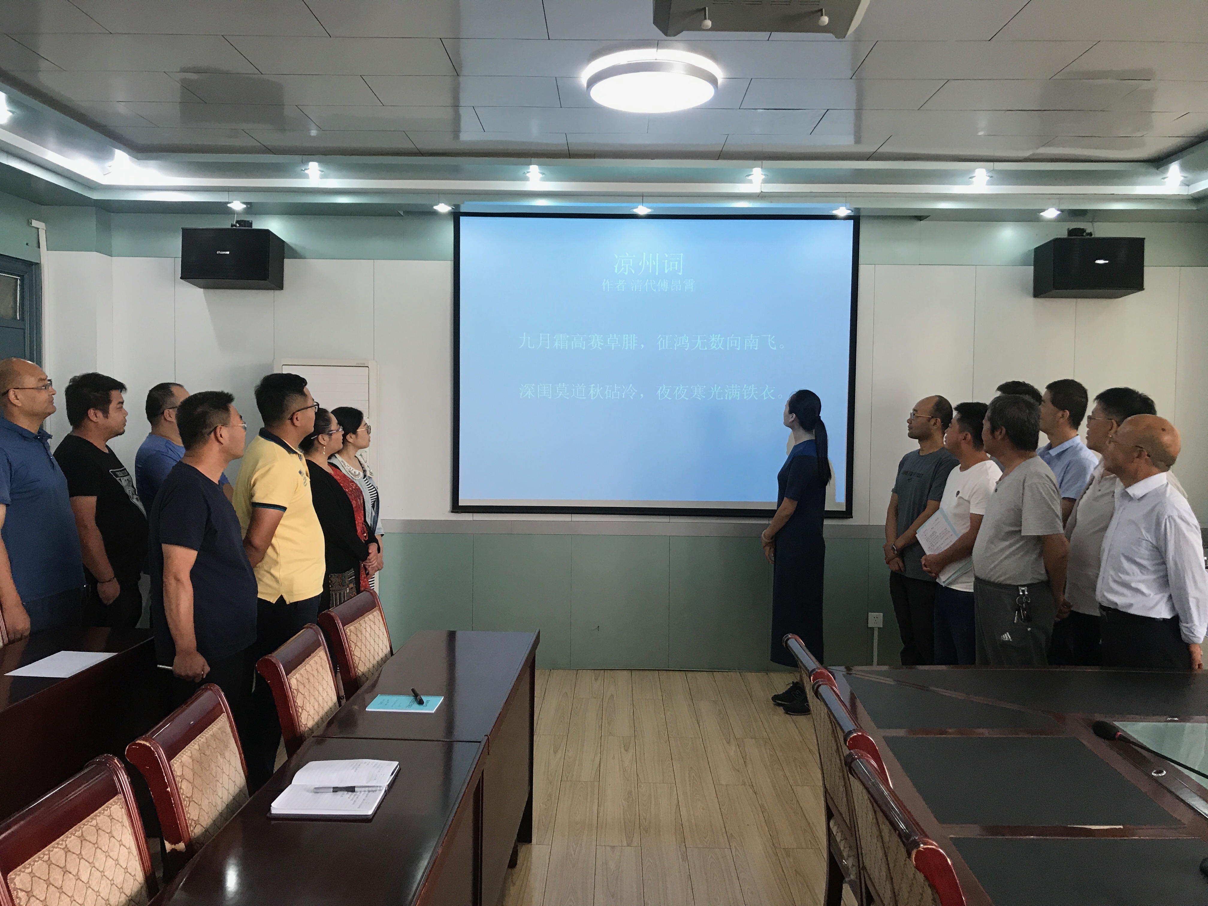 ? ? 2018年8月27日下午,建筑工程系全體教師,在博學(xué)樓會議室進行了“萬人吟誦涼州詞“活動。誦讀內(nèi)容為漢唐以來的經(jīng)典涼州詞,伴隨著悠揚的旋律,全體教師在張曦老師的領(lǐng)誦下,吟誦了經(jīng)典涼州詞句"彎彎月出掛城頭,城頭月出照涼州。涼州七里十萬家,胡人半解彈琵琶。"等。