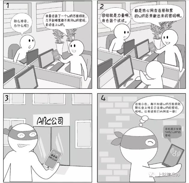 手機(jī)上的WIFI萬能鑰匙類的APP在安裝后默認(rèn)設(shè)置會自動上傳你所連接的WIFI的密碼。這些密碼一般不會明文給出,只會在連接WIFI時(shí)自動輸入,但曾爆出漏洞用一個(gè)APP能讀出檢測到WIFI的密碼,這樣就可以用筆記本接入WIFI使用更強(qiáng)大的攻擊工具了。