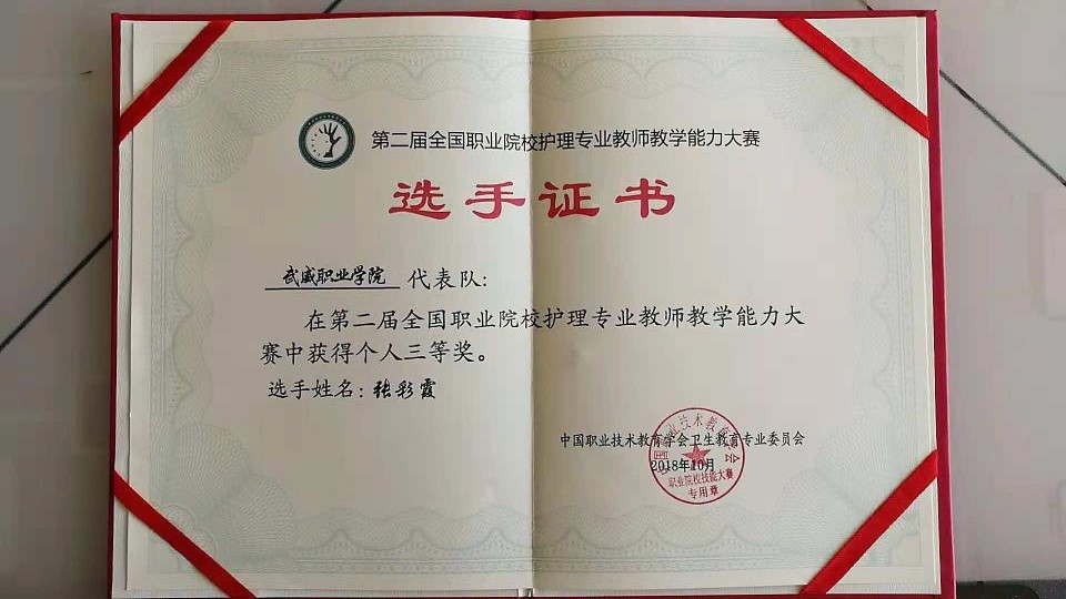 競賽共分為理論考核、說課程和臨床護理技能操作三個部分。其中,臨床護理技能操作部又分為三項,心肺復蘇術和靜脈輸液操作技術為必選項目,置胃管技術和氣管切開護理技術為抽選項目。經過三天緊張激烈的比拼,通過了全部考核內容的綜合評定,最終張彩霞老師獲得了三等獎。