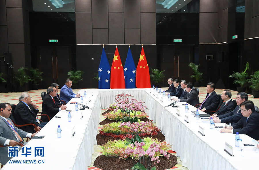11月16日,國家主席習(xí)近平在莫爾茲比港分別會見建交太平洋島國領(lǐng)導(dǎo)人。這是習(xí)近平會見密克羅尼西亞聯(lián)邦總統(tǒng)克里斯琴。 新華社記者 龐興雷 攝