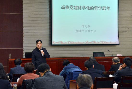 陳克恭在題為《高校黨建科學化的哲學思考》的講座中,以其獨特視角通過回顧中國近代史,闡明了中國共產黨執(zhí)政的客觀實在性。他認為,要用中國智慧、中國思維把馬克思主義和西方科學有機統(tǒng)一起來,構建具有中國特色、中國風格、中國氣派的哲學社會科學體系。并以西北師大為例,就大學治理體系的現代化提出了自己的思考。