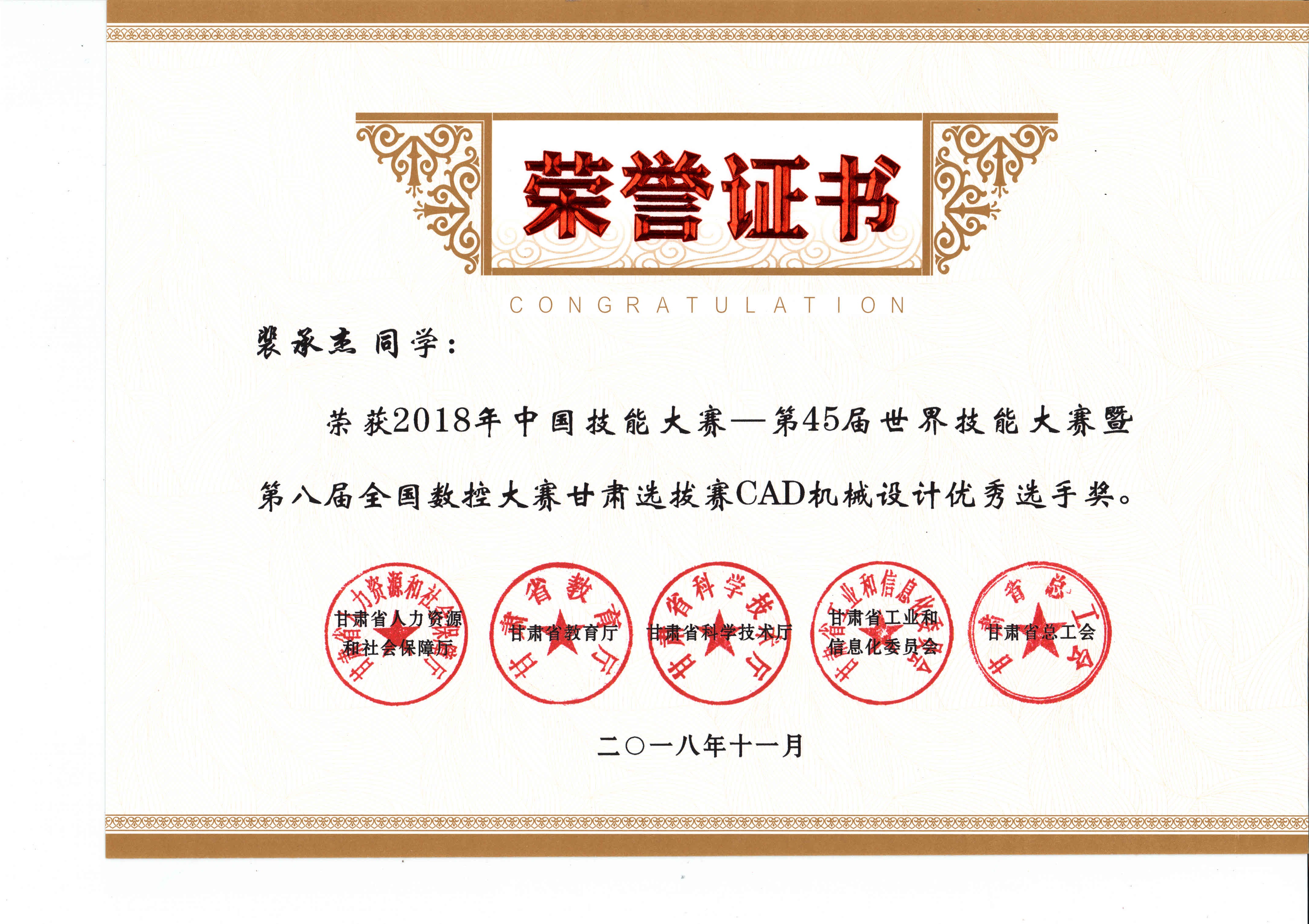 2018年中國技能大賽--第45屆世界技能大賽暨第八屆全國數(shù)控大賽甘肅選拔賽(CAD機(jī)械設(shè)計項目)獲獎證書