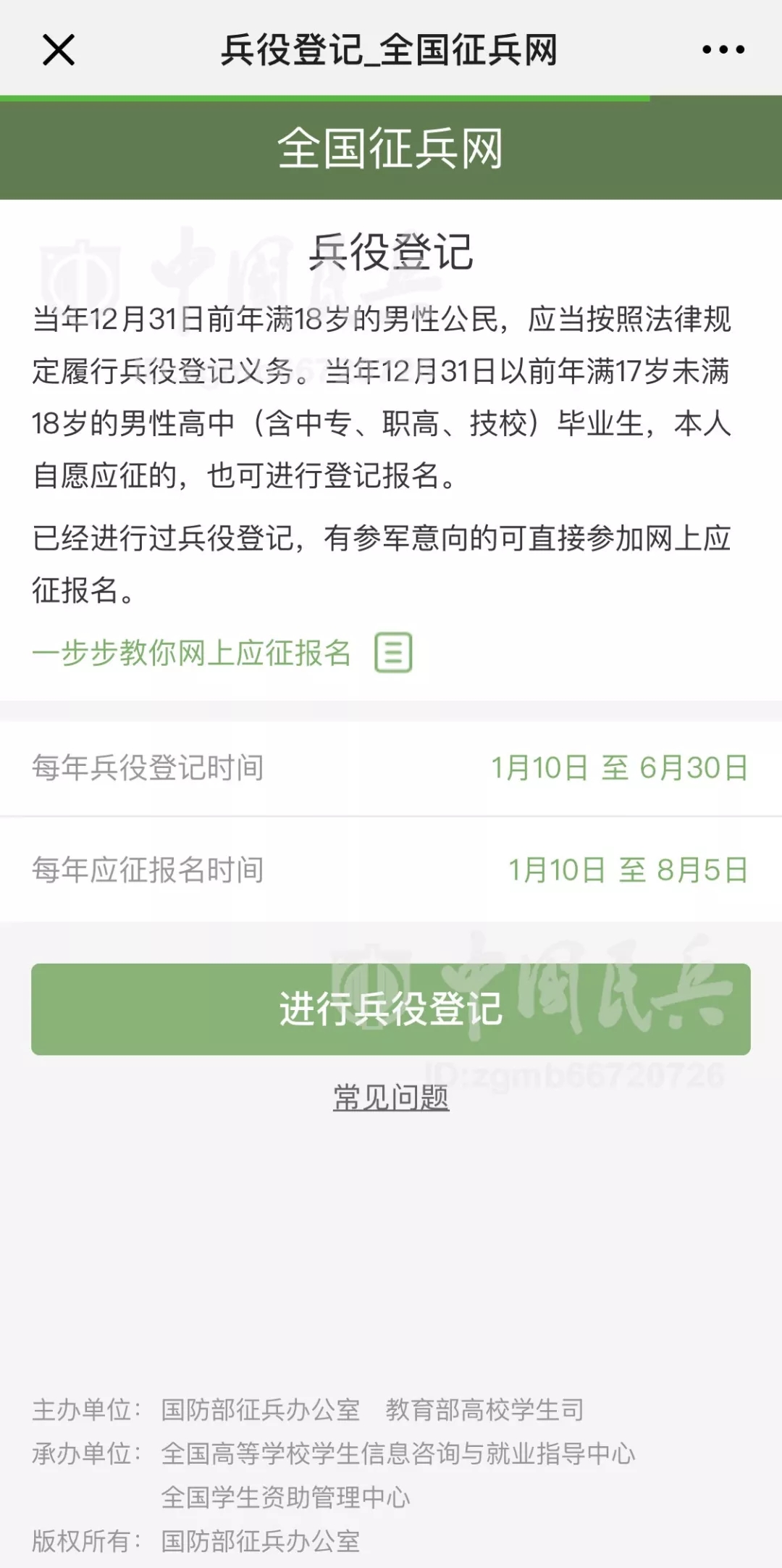 中國民兵北京1月9日電?張東華、記者劉國順報道:日前,國防部征兵辦公室下發(fā)《關(guān)于做好2019年征兵準(zhǔn)備工作的通知》,對新年度征兵準(zhǔn)備工作進行安排部署,要求各地深入貫徹習(xí)近平強軍思想,全面聚焦備戰(zhàn)打仗,統(tǒng)籌推進征兵組織建設(shè)、能力建設(shè)、法規(guī)建設(shè)、廉政建設(shè),確保高質(zhì)量完成新年度征兵任務(wù),并明確全國征兵網(wǎng)(網(wǎng)址:http://www.gfbzb.gov.cn),或關(guān)注“中國民兵”微信公眾號(ID:zgmb66720726)1月10日正式開通,受理網(wǎng)上兵役登記、應(yīng)征報名和政策咨詢等工作事項。