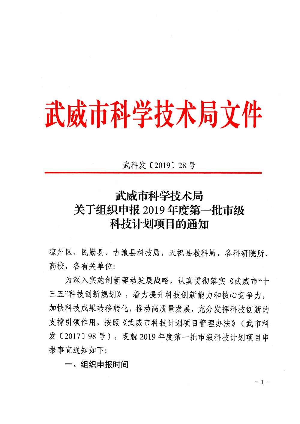 轉(zhuǎn)發(fā)武威市科學(xué)技術(shù)局關(guān)于組織申報2019年度第一批市級科技計劃項目的通知