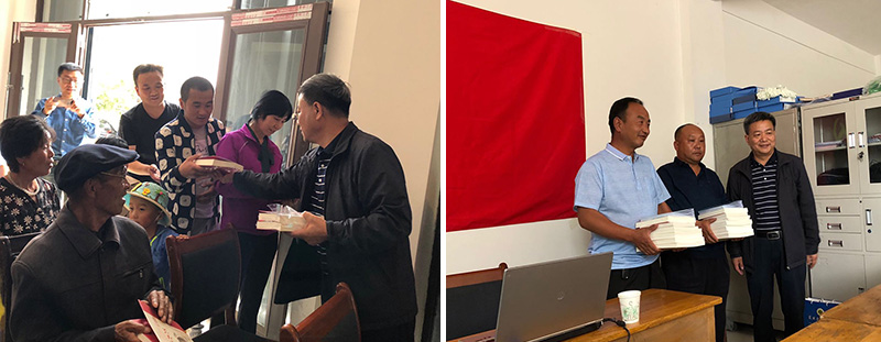 課后,學(xué)院領(lǐng)導(dǎo)把《習(xí)近平新時代中國特色社會主義思想學(xué)習(xí)綱要》《習(xí)近平新時代中國特色社會主義思想三十講》《全國優(yōu)秀共產(chǎn)黨員風(fēng)采錄》《新時代黨支部規(guī)范化建設(shè)工作實用手冊》和“掃黑除惡”知識手冊等14類50多冊黨建書籍分別贈送給蘆草溝村、尚家臺村黨支部和駐村工作隊,還向聽課的村民黨員贈送《習(xí)近平的七年知青歲月》等書籍。進村入戶的幫扶干部向幫扶戶村民黨員贈送了黨建書籍。共贈送100多冊價值2700多元黨建書籍和掃黑除惡手冊。