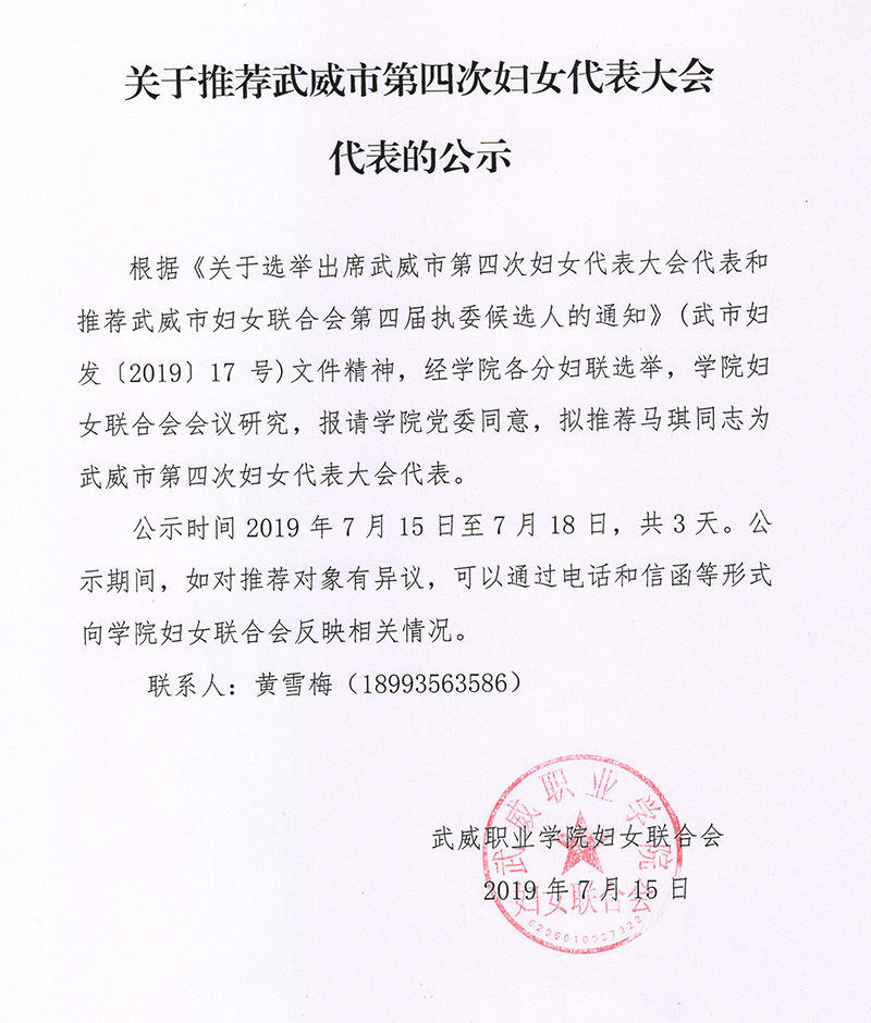 關(guān)于推薦武威市第四次婦女代表大會代表的公示