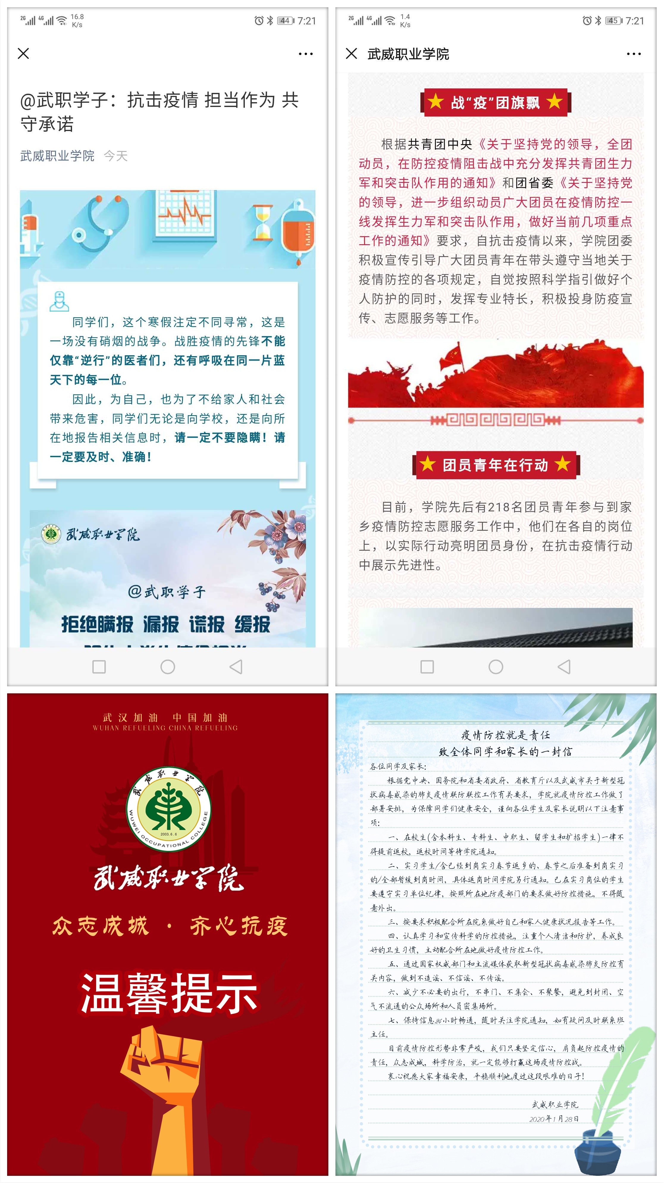 學(xué)生工作處及時發(fā)布了致學(xué)生和家長的一封信《疫情防控就是責(zé)任》,團(tuán)委制作和推送了《春暖花開疫情散 我們武職再相見》溫馨提示短片和《@武職學(xué)子:抗擊疫情 擔(dān)當(dāng)作為 共守承諾》倡議,用生動形象的表述要求和提醒同學(xué)們不得提前返校,做好個人防護(hù)措施,遵守當(dāng)?shù)匾咔榉揽馗黜椧?,做到不信謠不傳謠,及時向?qū)W院報送個人防疫相關(guān)信息,不瞞報不慌報。各院系輔導(dǎo)員和班主任都會第一時間在學(xué)生群里轉(zhuǎn)發(fā),同時把學(xué)院網(wǎng)站和微信平臺上科學(xué)的防控知識和上級的有關(guān)精神及時傳達(dá)給學(xué)生,當(dāng)好疫情防控的宣傳員,做到戰(zhàn)疫有“力”。