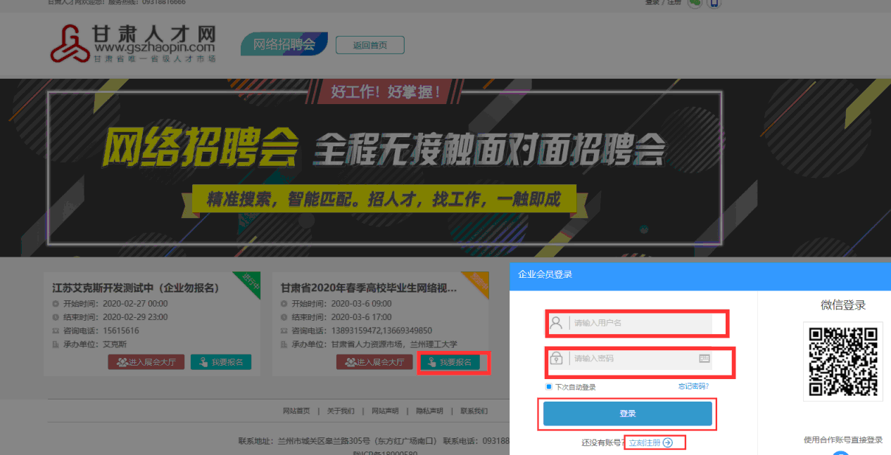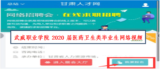 1.手機(jī)瀏覽器搜索甘肅人才網(wǎng)或輸入網(wǎng)址(www.gszhaopin.com),進(jìn)入網(wǎng)站首頁(yè)點(diǎn)擊“網(wǎng)絡(luò)招聘會(huì)”,——選擇“武威職業(yè)學(xué)院2020屆醫(yī)藥衛(wèi)生類畢業(yè)生網(wǎng)絡(luò)視頻雙選會(huì)”點(diǎn)擊“我要報(bào)名”按鈕,登錄企業(yè)后臺(tái)(無(wú)賬號(hào)點(diǎn)擊“立即注冊(cè)”,資質(zhì)通過(guò)審核后再報(bào)名),待定審核。