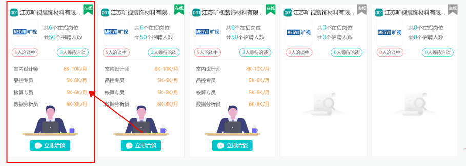 一是主動(dòng)在“新入場(chǎng)求職者”標(biāo)簽下,瀏覽入場(chǎng)求職人員簡(jiǎn)歷,點(diǎn)擊“立即洽談”對(duì)意向洽談人員發(fā)出溝通申請(qǐng),并進(jìn)行面試洽談。如下圖: