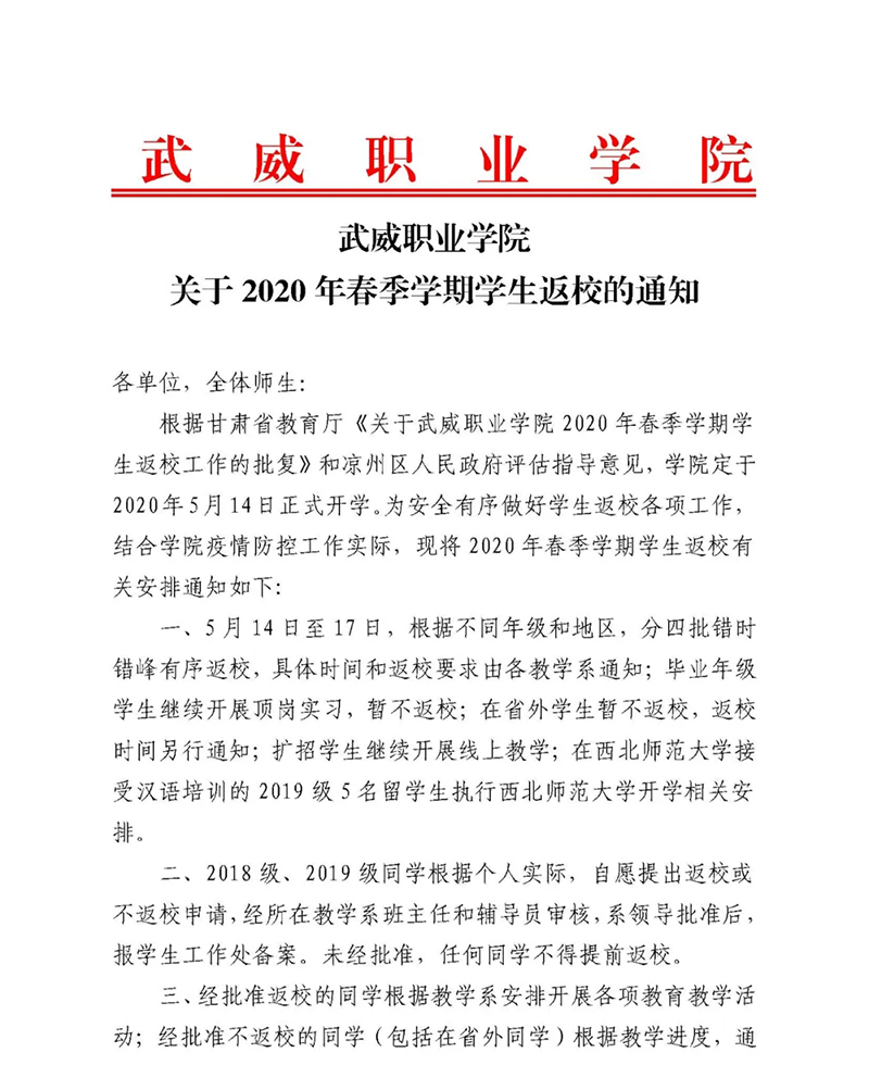 武威職業(yè)學(xué)院關(guān)于2020年春季學(xué)期學(xué)生返校的通知