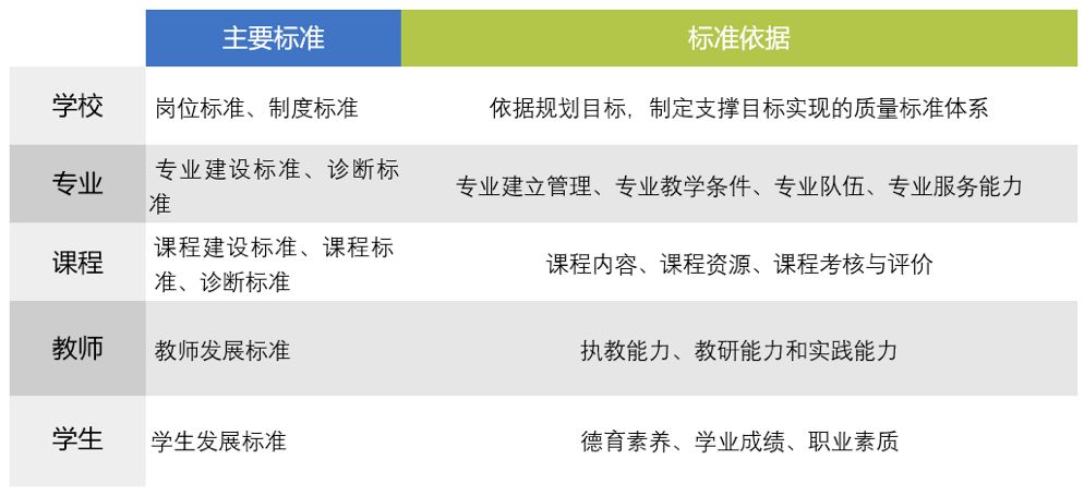 標(biāo)準(zhǔn)制定要體現(xiàn)多元質(zhì)量觀,采用剛性與柔性相結(jié)合的辦法,解決特色發(fā)展與創(chuàng)新發(fā)展的問(wèn)題,堅(jiān)持“目標(biāo)導(dǎo)向與問(wèn)題導(dǎo)向”的統(tǒng)一。從實(shí)際出發(fā),查找問(wèn)題、研究問(wèn)題、解決問(wèn)題,重點(diǎn)解決學(xué)校內(nèi)部治理中存在的“透明管理”等突出問(wèn)題;從專(zhuān)業(yè)建立管理、專(zhuān)業(yè)教學(xué)條件、專(zhuān)業(yè)隊(duì)伍、專(zhuān)業(yè)服務(wù)能力等維度制定專(zhuān)業(yè)建設(shè)標(biāo)準(zhǔn)和診斷標(biāo)準(zhǔn);從課程內(nèi)容、課程資源、課程考核與評(píng)價(jià)等維度制定課程建設(shè)標(biāo)準(zhǔn)、課程標(biāo)準(zhǔn)和課程診斷標(biāo)準(zhǔn);教師發(fā)展標(biāo)準(zhǔn)要以提升教師的執(zhí)教能力、教研能力和實(shí)踐能力為要素;學(xué)生發(fā)展標(biāo)準(zhǔn)要重點(diǎn)考慮學(xué)生的德育素養(yǎng)、學(xué)業(yè)成績(jī)、職業(yè)素質(zhì)。通過(guò)標(biāo)準(zhǔn)體系的打造,形成學(xué)校內(nèi)部質(zhì)量保證體系的標(biāo)準(zhǔn)鏈。