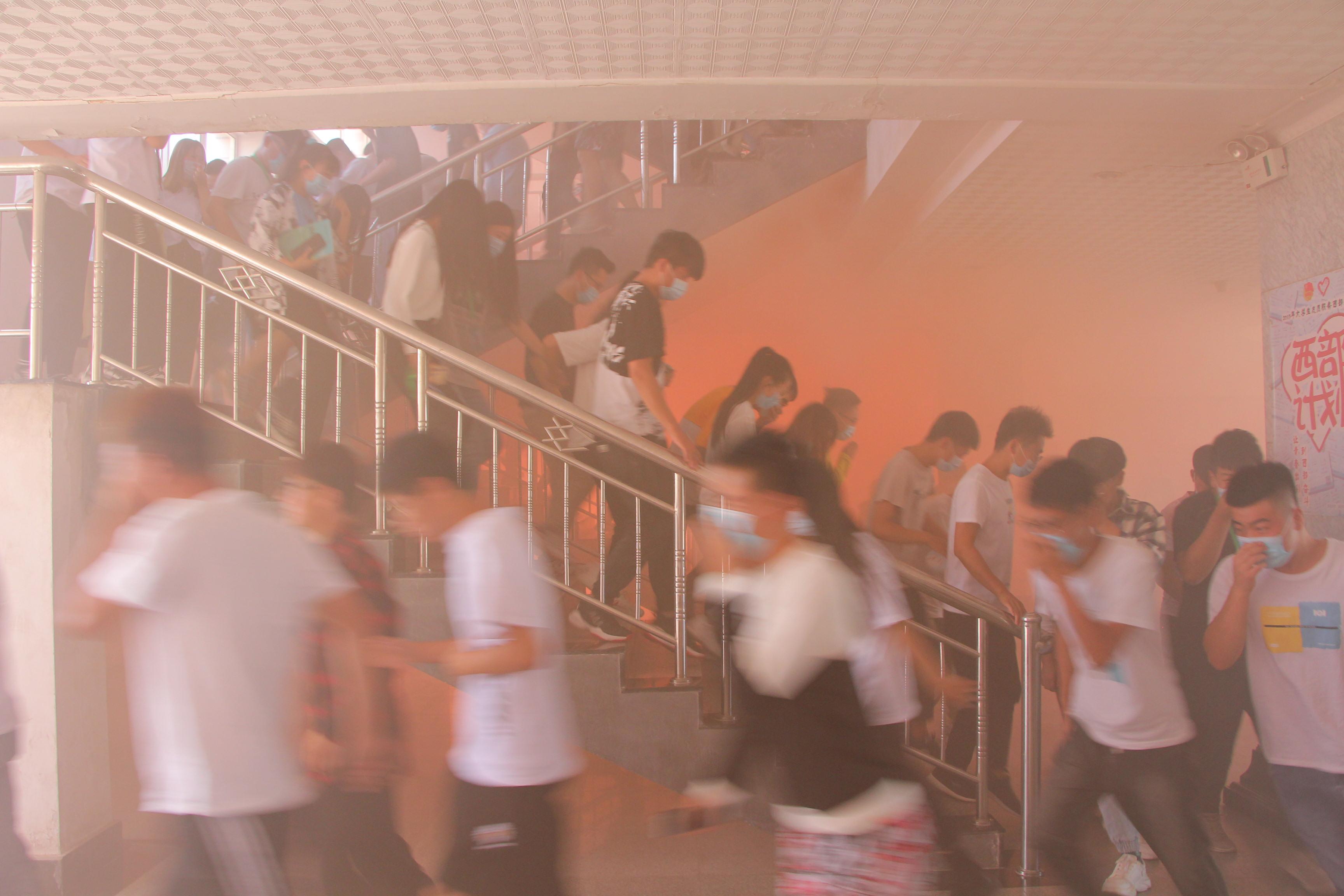 下午4點46分,疏散演練正式開始。隨著消防警報響起,各教學班上課教師立即停止上課組織學生疏散,學生用濕毛巾捂住口鼻,按照逃生路線有序疏散。在3分鐘內,6000多名參演師生全部撤離到了安全地帶,演練取得圓滿成功。