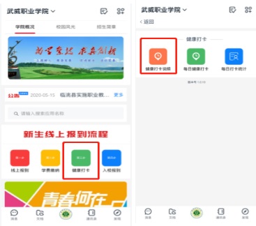 新生使用“智慧校園”賬號(hào),登錄釘釘平臺(tái),進(jìn)入“武威職業(yè)學(xué)院”組織架構(gòu),點(diǎn)擊武職門(mén)戶(hù)進(jìn)入新生線(xiàn)上報(bào)到流程。