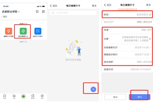 2.每日健康打卡:點(diǎn)擊每日健康打開(kāi)——點(diǎn)擊右下角?號(hào)——點(diǎn)擊姓名框選擇姓名——填寫(xiě)內(nèi)容——提交。