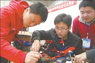 ⑥4月12日,江蘇科技大學舉辦首屆慧魚機器人拼裝組合設(shè)計大賽,圖為大學生在進行機器人拼裝比賽。