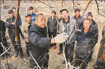 ⑦ 李保國(前左)在河北省內(nèi)丘縣崗底村向村民講解果樹修剪知識(1月27日攝)。