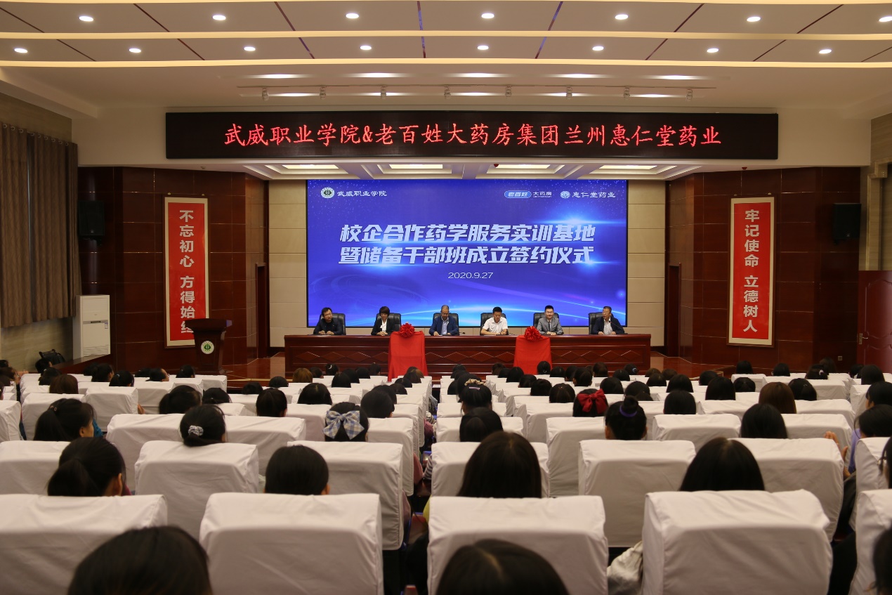 2020年9月27日上午,學院與老百姓集團﹒蘭州惠仁堂藥業(yè)連鎖有限責任公司“校企共建藥學實訓基地”暨“老百姓儲備干部班”成立簽約儀式在大學生活動中心菁英廳舉行。儀式由藥學系主任魏潤明主持,學院黨委副書記翟存祥、老百姓集團總部和蘭州惠仁堂藥業(yè)公司相關領導出席,藥學系教師代表和2019級藥學、中藥學專業(yè)學生代表共計220人參加了簽約儀式。