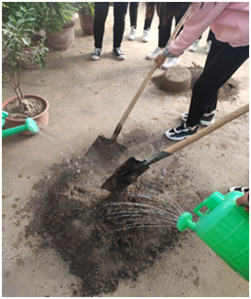種植體驗(yàn)活動(dòng)前,為了讓學(xué)生更好地了解種植知識(shí),張老師給同學(xué)們講解了植物種植的條件、如何根據(jù)季節(jié)選擇種植的種類,以及育苗、澆水、施肥、防蟲(chóng)過(guò)程中的注意事項(xiàng)。在活動(dòng)中,學(xué)生與老師合作完成種菜任務(wù),一起探討種植經(jīng)驗(yàn)、勞動(dòng)技能。