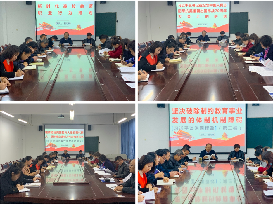 黃文源領(lǐng)學(xué)了《習近平談治國理政》(第三卷)第十二條 提高保障和改善民生水平——堅決破除制約教育事業(yè)發(fā)展的體質(zhì)機制障礙,解讀了《新時代高校教師職業(yè)行為十項準則》,要求所有教師要做以德立身、以德立學(xué)、以德施教、以德育德的楷模。楊如松領(lǐng)學(xué)了《習近平總書記教育重要論述講義》第二講 培養(yǎng)擔當民族復(fù)興大任的時代新人——堅持把立德樹人作為根本任務(wù)。楊建紅老師領(lǐng)學(xué)了習近平總書記在紀念中國 人民志愿軍抗美援朝出國作戰(zhàn)70周年大會的講話。