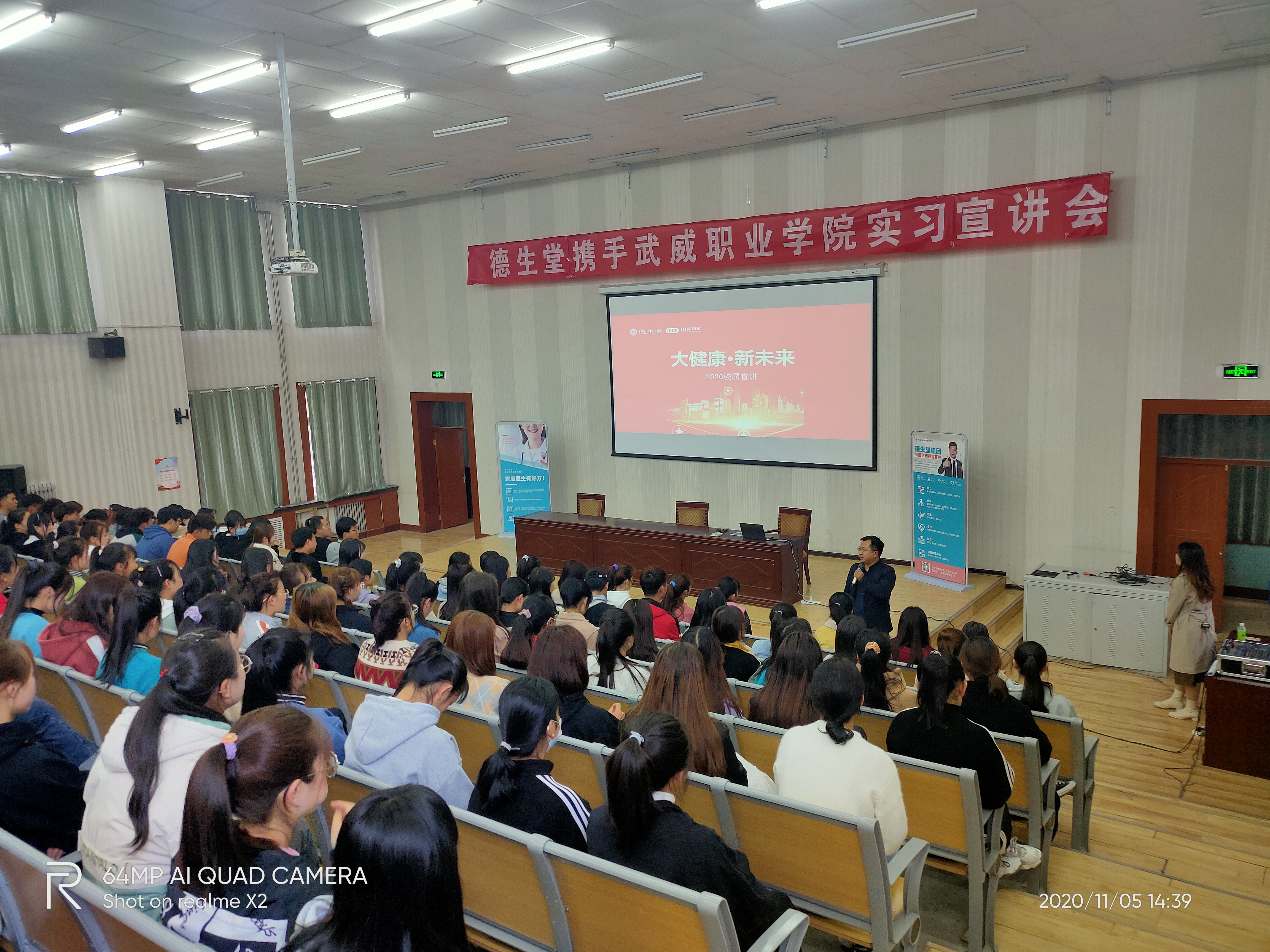 2020年11月5日,武威職業(yè)學院藥學系攜手德生堂在正德廳舉辦實習宣講會。藥學系黨總支書記、主任魏潤明、藥學系副主任楊建美、德生堂集團武威區(qū)域經理呂福英及2021屆172名畢業(yè)生參加宣講會。