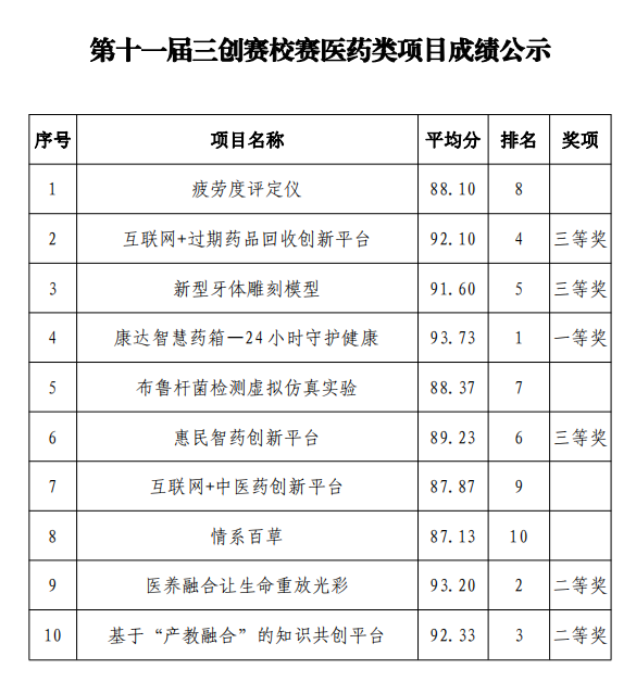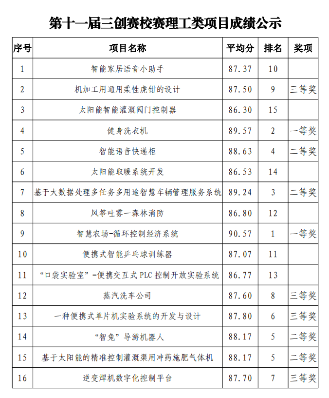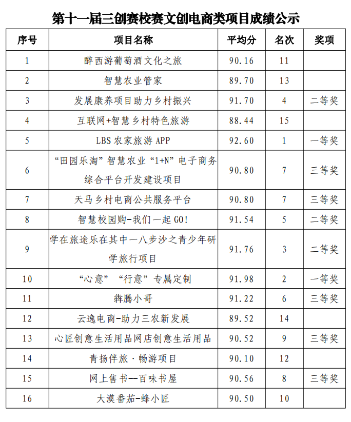 按照第十一屆三創(chuàng)賽省賽組委會要求,學(xué)院于4月24日在創(chuàng)新創(chuàng)業(yè)中心舉辦了校賽,經(jīng)學(xué)生團(tuán)隊(duì)申報(bào)、現(xiàn)場答辯及專家評審環(huán)節(jié),校賽已圓滿完成。按照校賽方案,一等獎(jiǎng)不超過參賽隊(duì)數(shù)的 10%,二等獎(jiǎng)不超過參賽隊(duì)數(shù)的 20%,三等獎(jiǎng)不超過參賽隊(duì)數(shù)的 30%?,F(xiàn)將第十一屆三創(chuàng)賽校賽獲獎(jiǎng)項(xiàng)目成績和獲獎(jiǎng)名次予以公示,公示期三日。