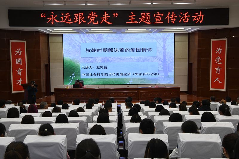 5月21日,中國(guó)社會(huì)科學(xué)院古代史研究所黨委書記、郭沫若紀(jì)念館原館長(zhǎng)趙笑潔來學(xué)院作《抗戰(zhàn)時(shí)期郭沫若的愛國(guó)情懷》專題講座,學(xué)院在家院領(lǐng)導(dǎo)、副科級(jí)以上干部、師生代表共計(jì)220人聆聽了講座。