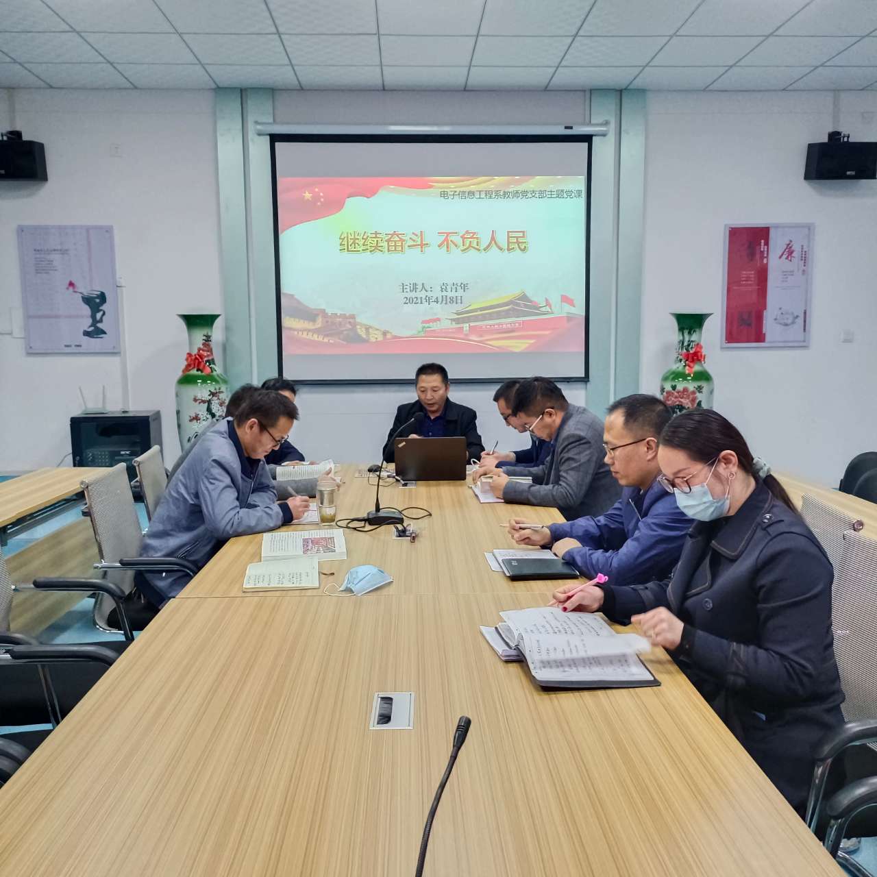 4月8日,電子信息工程系黨總支開展黨總支書記講黨課活動,全體教師黨員參加了學(xué)習(xí)。電子信息工程系黨總支書記袁青年同志以“繼續(xù)奮斗、不負人民”主題講了黨課。