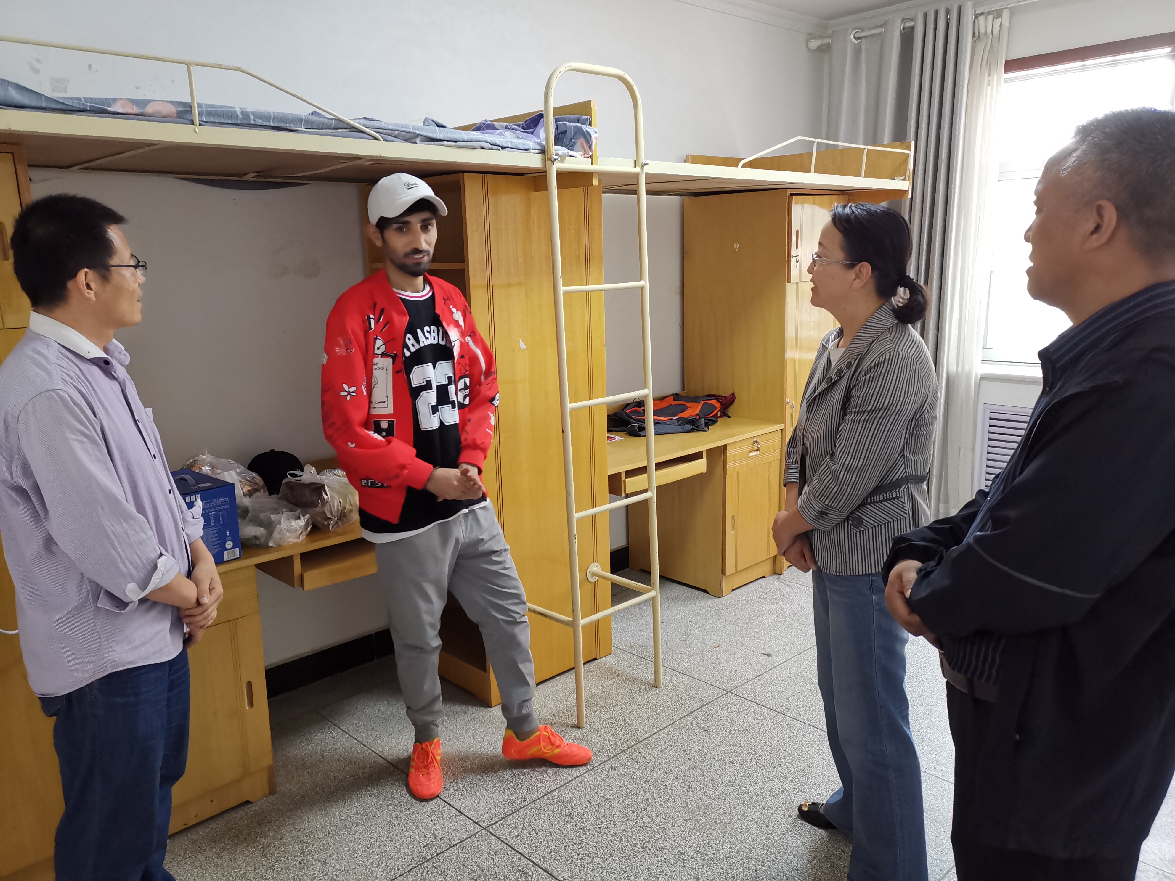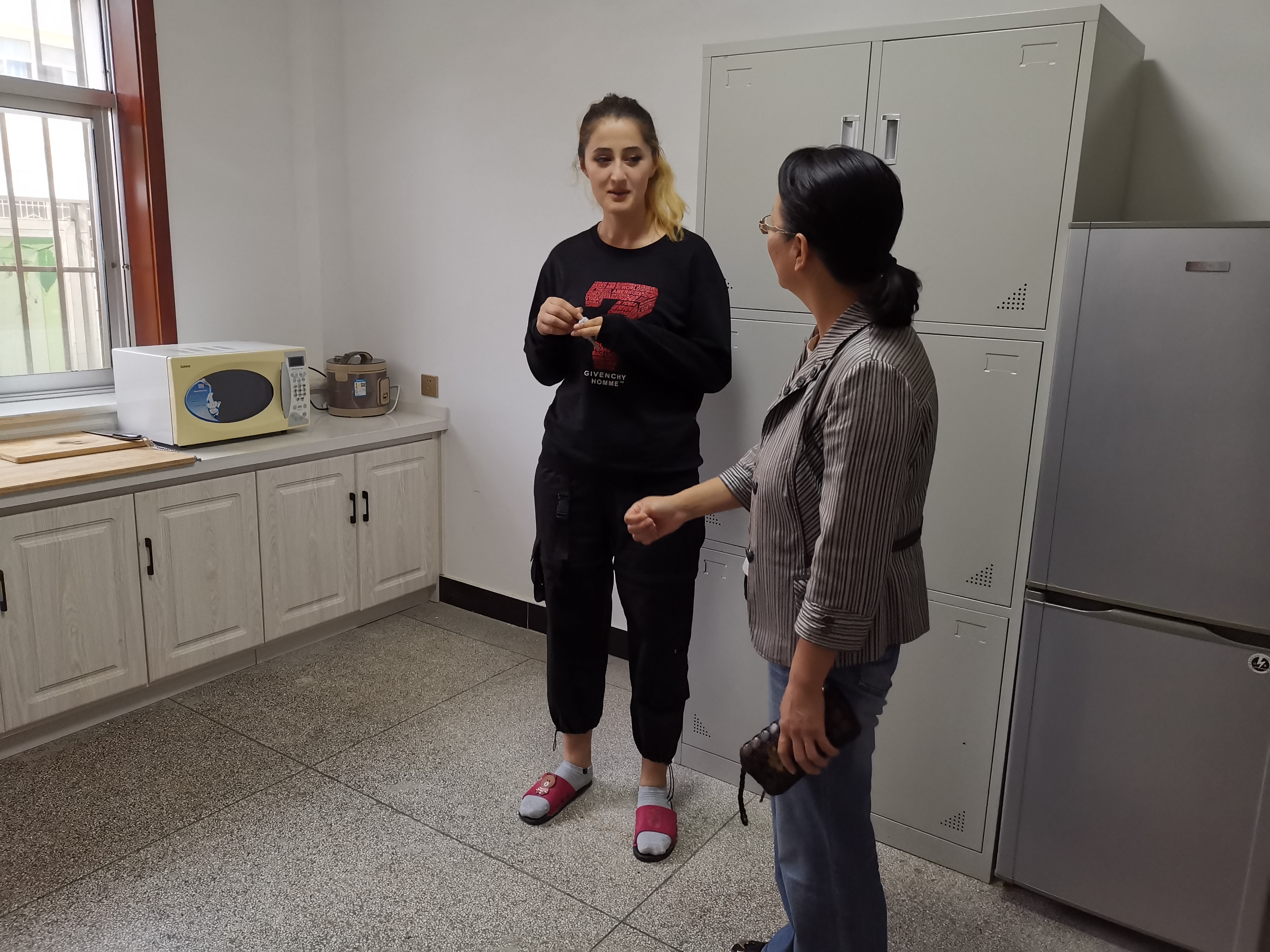 田迎春先后深入2019級(jí)、2021級(jí)來華留學(xué)生宿舍、廚房,查看、了解留學(xué)生住宿、生活情況,向留學(xué)生送上慰問品。在留學(xué)生宿舍,田迎春與留學(xué)生親切交談,關(guān)切詢問留學(xué)生日常生活、專業(yè)學(xué)習(xí)、漢語學(xué)習(xí)等情況。她向留學(xué)生簡(jiǎn)要介紹了中秋節(jié)、國慶節(jié)的來歷、風(fēng)俗及意義,留學(xué)生們對(duì)中國傳統(tǒng)文化表現(xiàn)出濃厚興趣;她指出,留學(xué)生背井離鄉(xiāng)來華求學(xué),遇到困難在所難免,但要堅(jiān)定信心,學(xué)院會(huì)盡力滿足留學(xué)生學(xué)習(xí)、生活的需要;她鼓勵(lì)留學(xué)生積極主動(dòng)融入學(xué)院大家庭,廣交朋友,在融入、融合過程中體會(huì)在華學(xué)習(xí)生活的樂趣;她希望留學(xué)生珍惜寶貴的來華學(xué)習(xí)的機(jī)會(huì),不僅要學(xué)好理論知識(shí),而且要學(xué)好操作技能,不僅要學(xué)好專業(yè)知識(shí),而且要學(xué)好優(yōu)秀中華文化,講好中國故事,向世界展示真實(shí)的中國,爭(zhēng)做知華友華愛華的留學(xué)生,爭(zhēng)做中國與世界各國友好的使者。