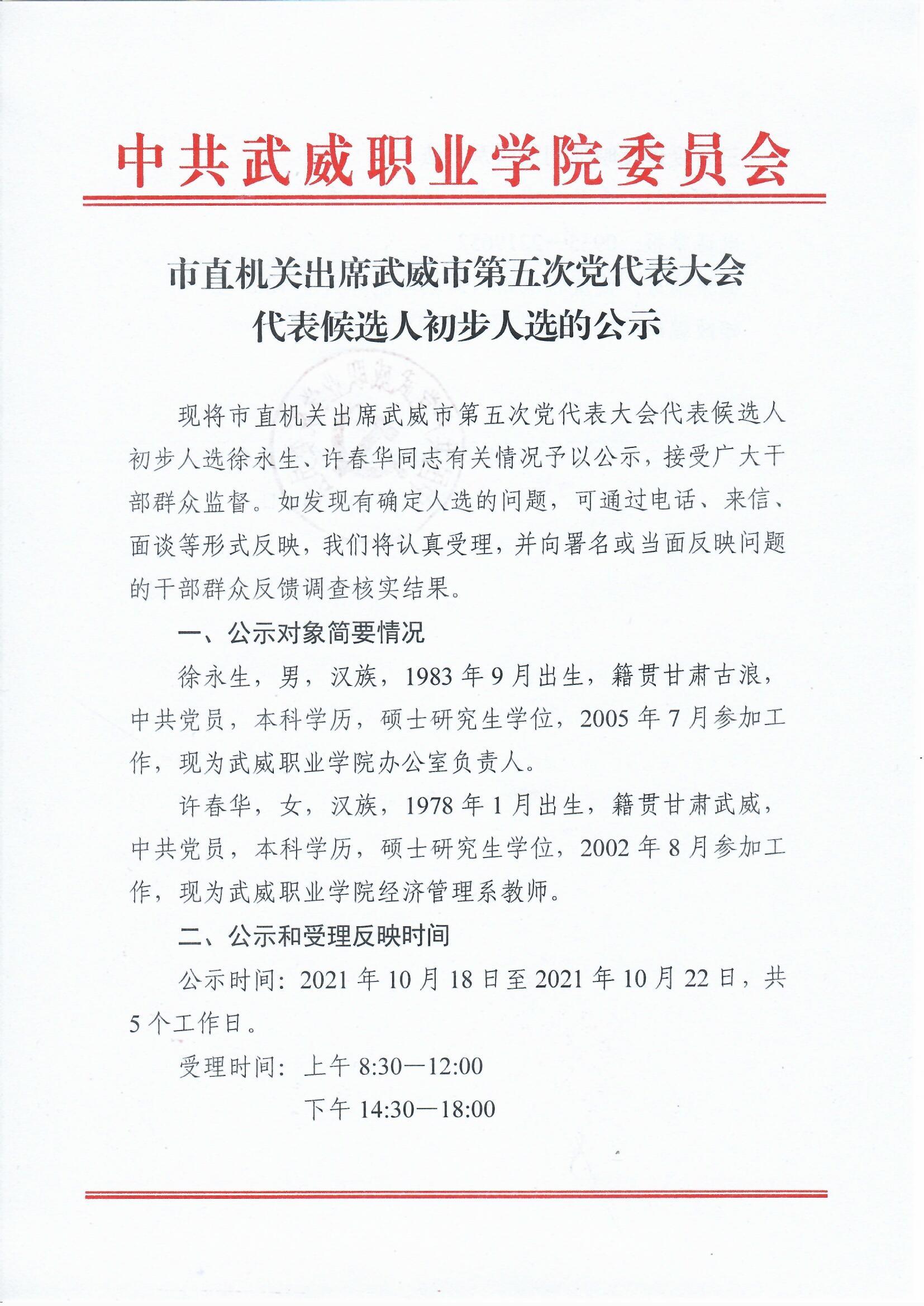 市直機(jī)關(guān)出席武威市第五次黨代表大會代表候選人初步人選的公示