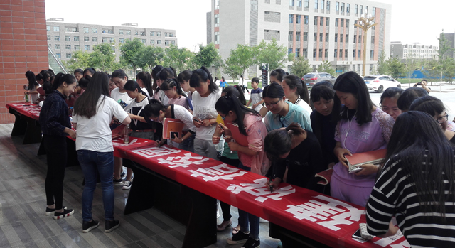 6月14日是第九個全國“信用記錄關愛日”。為進一步加強我院學生的誠信教育,結合當前學院正在進行的社會信用體系建設及國家助學貸款工作,當日中午12時,學生工作處在大學生活動中心廣場發(fā)起“創(chuàng)建誠信校園 樹立誠信學風 做誠信學子”的主題簽名倡議活動。200多名學生頂著炎炎烈日前來參加簽名活動,并在橫幅上鄭重簽下了自己的名字。