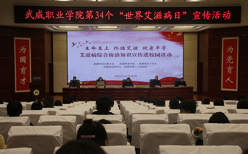 11月30日,學(xué)院在菁英廳開展了“生命至上 終結(jié)艾滋 健康平等”艾滋病綜合防治知識宣傳進校園活動。市疾控中心工會主席張富國、市婦聯(lián)副主席張惠華、學(xué)院黨委委員、副院長王守云,市第二人民醫(yī)院院長滕亮出席活動,活動由學(xué)院護理系黨總支書記張建輝主持,市紅十字會、市疾控中心、天馬行市民云數(shù)據(jù)有限公司工作人員及武威職業(yè)學(xué)院師生代表參加活動。