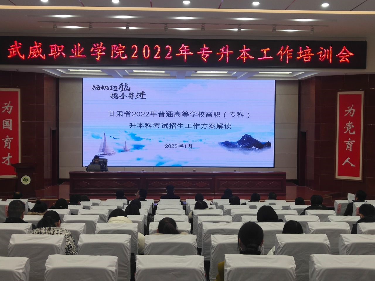 為貫徹落實甘肅省2022年普通專升本考試招生工作部署會會議精神,積極宣傳我省2022年“專升本”招生考試改革政策,引導(dǎo)學(xué)院應(yīng)屆畢業(yè)生積極報考“專升本”考試,拓寬畢業(yè)生就業(yè)渠道,實現(xiàn)高質(zhì)量就業(yè)。1月6日,招生就業(yè)處組織召開了學(xué)院2022年“專升本”工作培訓(xùn)會。相關(guān)部門負(fù)責(zé)人、各教學(xué)院系書記、主任、輔導(dǎo)員及畢業(yè)班班主任參加了會議。會議由招生就業(yè)處處長蔡柱山主持。