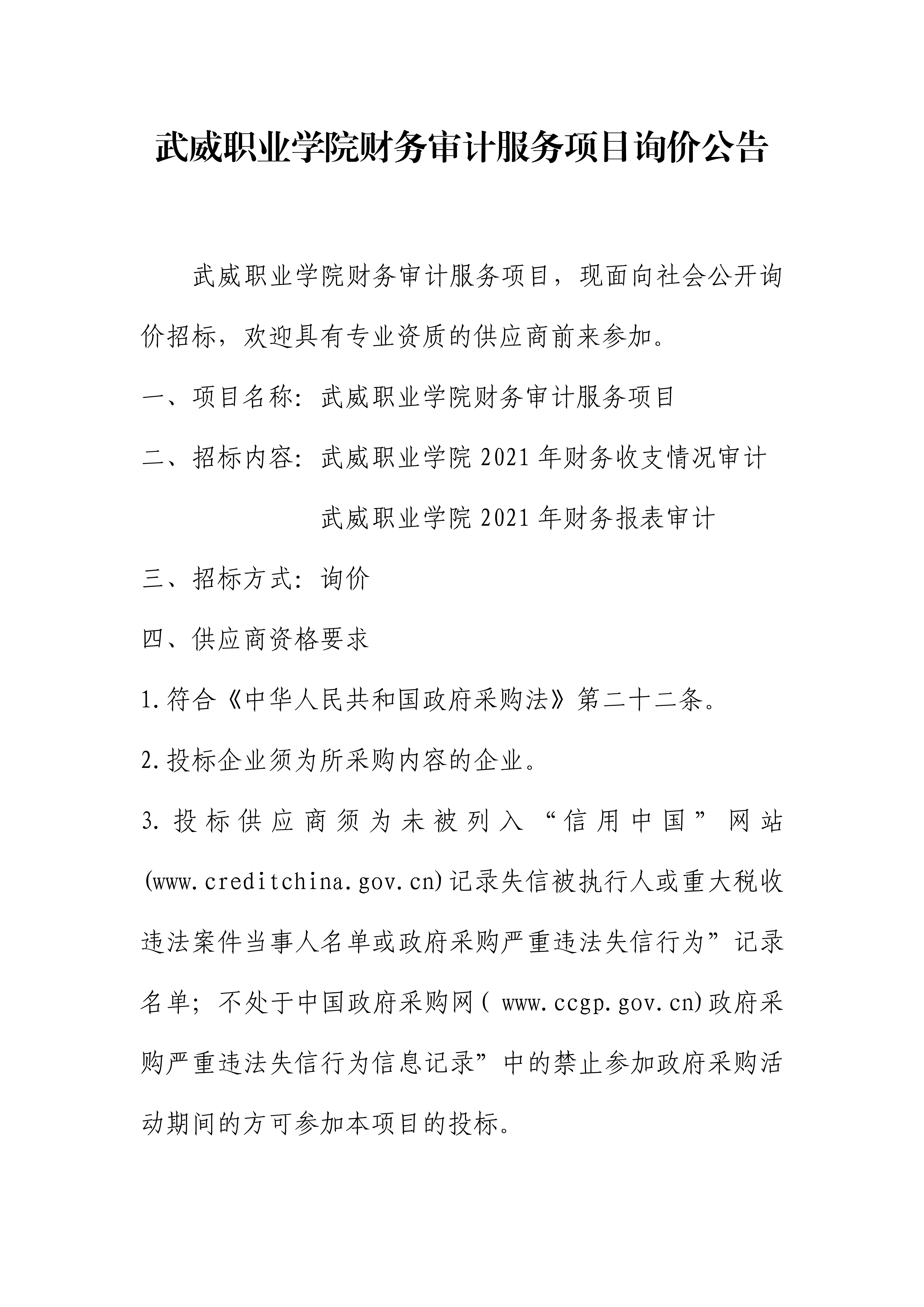 武威職業(yè)學(xué)院財(cái)務(wù)審計(jì)服務(wù)項(xiàng)目詢價(jià)公告