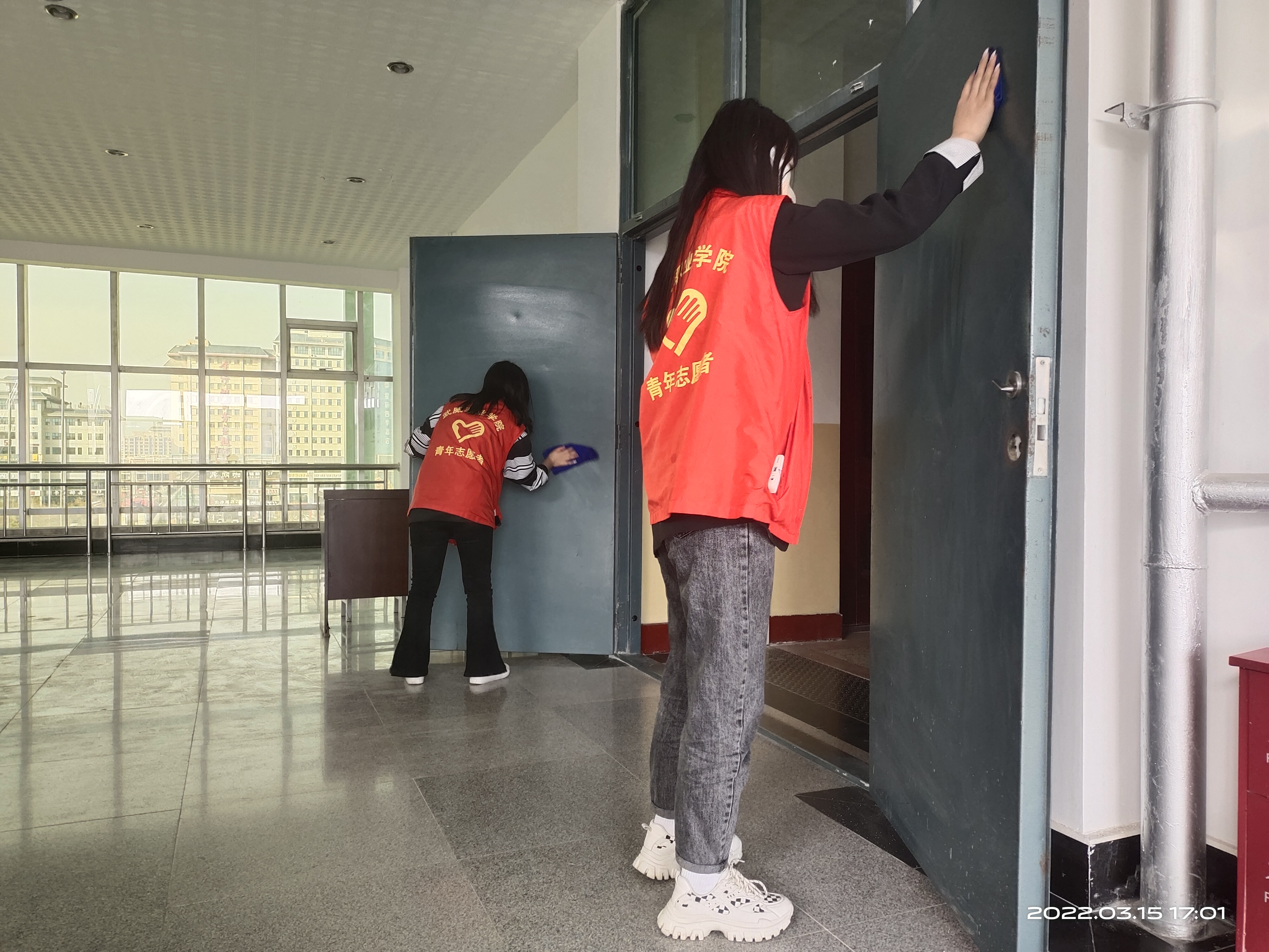 青年志愿者們不僅僅只是一個(gè)名義,他們不怕臟,不怕累,穿梭在校園各個(gè)角落,他們拿著掃帚、簸箕打掃衛(wèi)生死角,撿煙頭,還有一批在教學(xué)樓內(nèi)打掃公共教室的,有的在收拾垃圾,有的在擦黑板。教學(xué)樓門口也有他們的身影,在烈日炎炎下擦拭著玻璃,他們這種勇于參與志愿者活動(dòng)、不怕苦、不怕累的精神值得同學(xué)們學(xué)習(xí)。