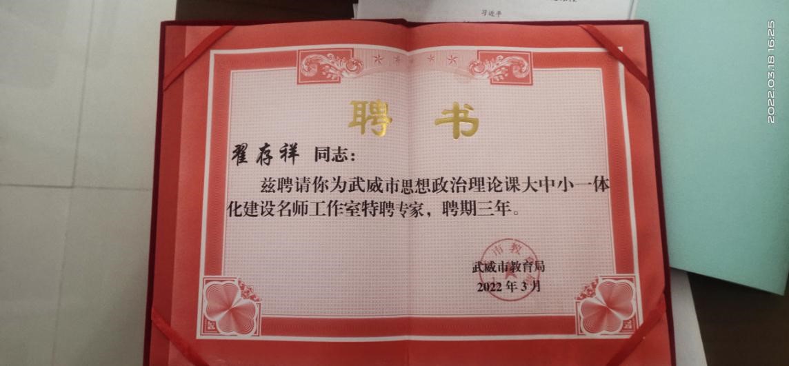 會(huì)議學(xué)習(xí)了習(xí)近平總書(shū)記在學(xué)校思想政治理論課教師座談會(huì)上的重要講話精神,總結(jié)了近年來(lái)武威市思政課建設(shè)取得的成績(jī),各縣區(qū)交流了經(jīng)驗(yàn)做法,安排部署了下一階段工作。同時(shí),舉行了武威市思想政治理論課大中小一體化建設(shè)名師工作室授牌和名師工作室特聘專家聘任儀式。學(xué)校思政課名師工作室負(fù)責(zé)人、黨委副書(shū)記翟存祥教授被聘為武威市思想政治理論課大中小一體化建設(shè)名師工作室特聘專家。