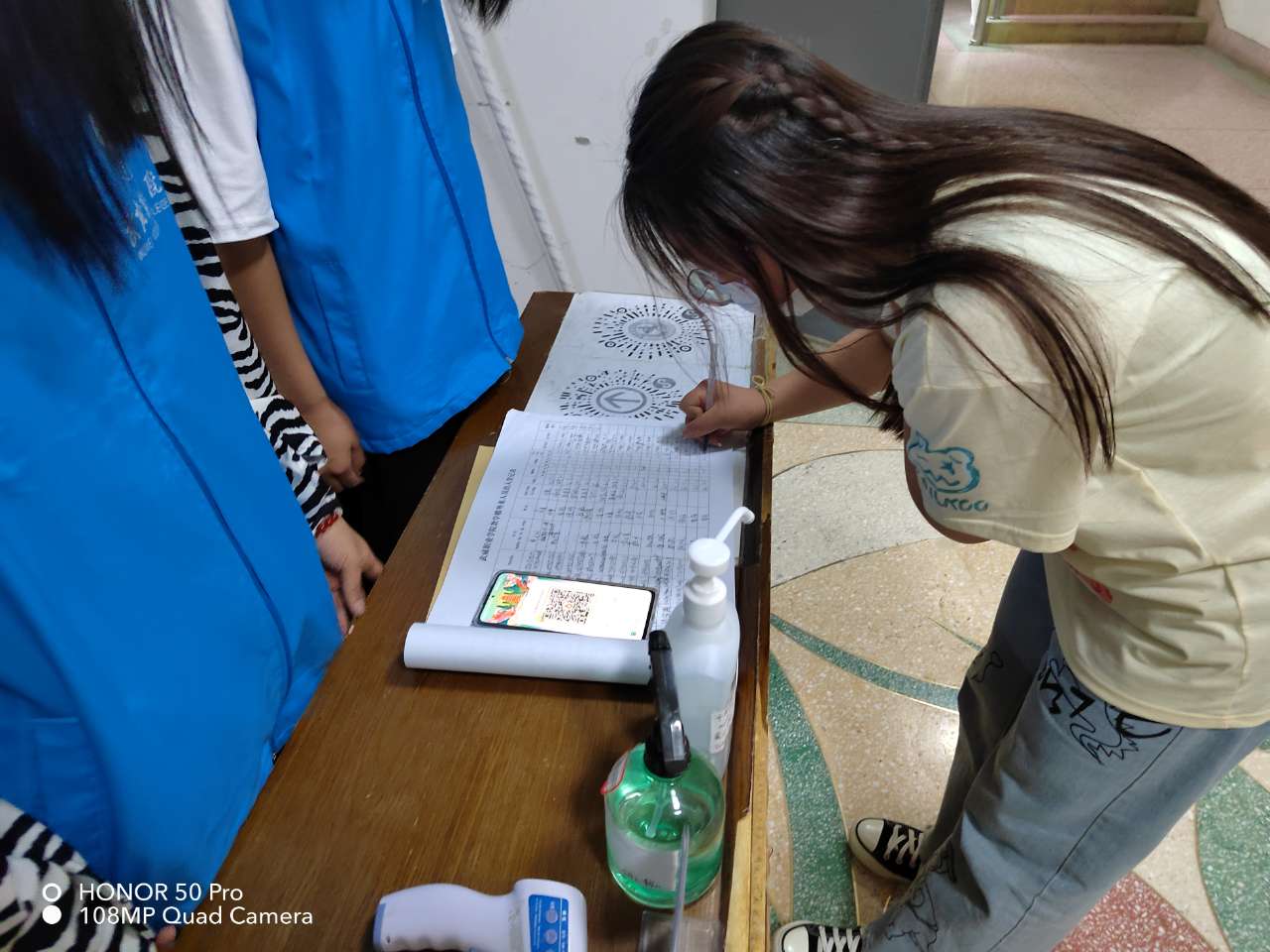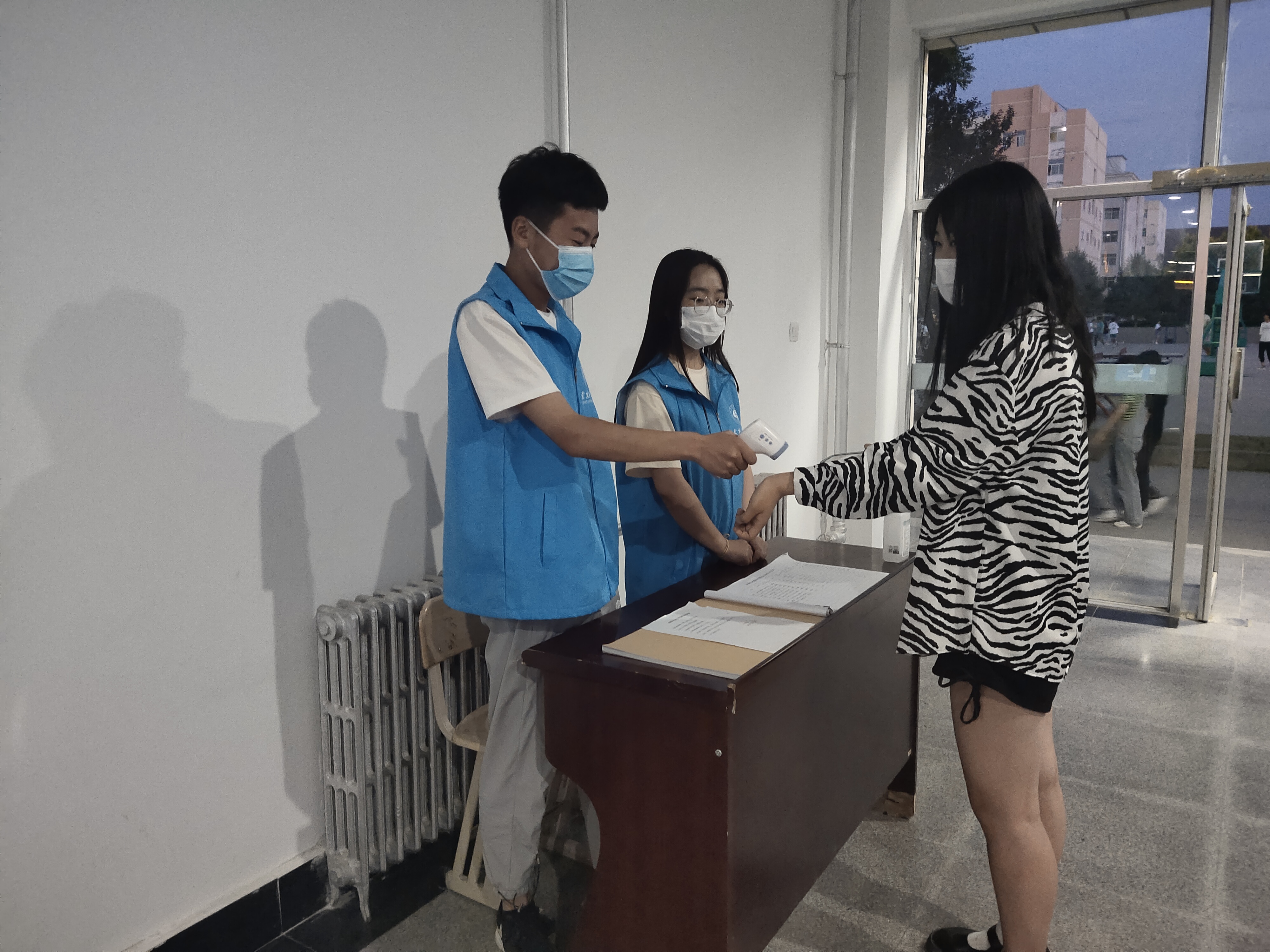 “您好,請(qǐng)出示一下您的健康碼、行程碼和核酸檢測(cè)證明,謝謝配合……”“您好,請(qǐng)?jiān)谶@邊做一下登記,謝謝配合?!蔽以嚎挂咧驹刚叻?wù)隊(duì),在食堂門(mén)口,水房門(mén)口,宿舍樓,教學(xué)樓門(mén)口,志愿者們身穿“紅馬甲”,以所在學(xué)院為單元按照疫情期間門(mén)禁管理要求開(kāi)展“疫情防控值班”志愿服務(wù)活動(dòng),凡來(lái)訪者一律要求戴口罩,亮健康碼,行程碼,測(cè)量體溫正常后方可通行。