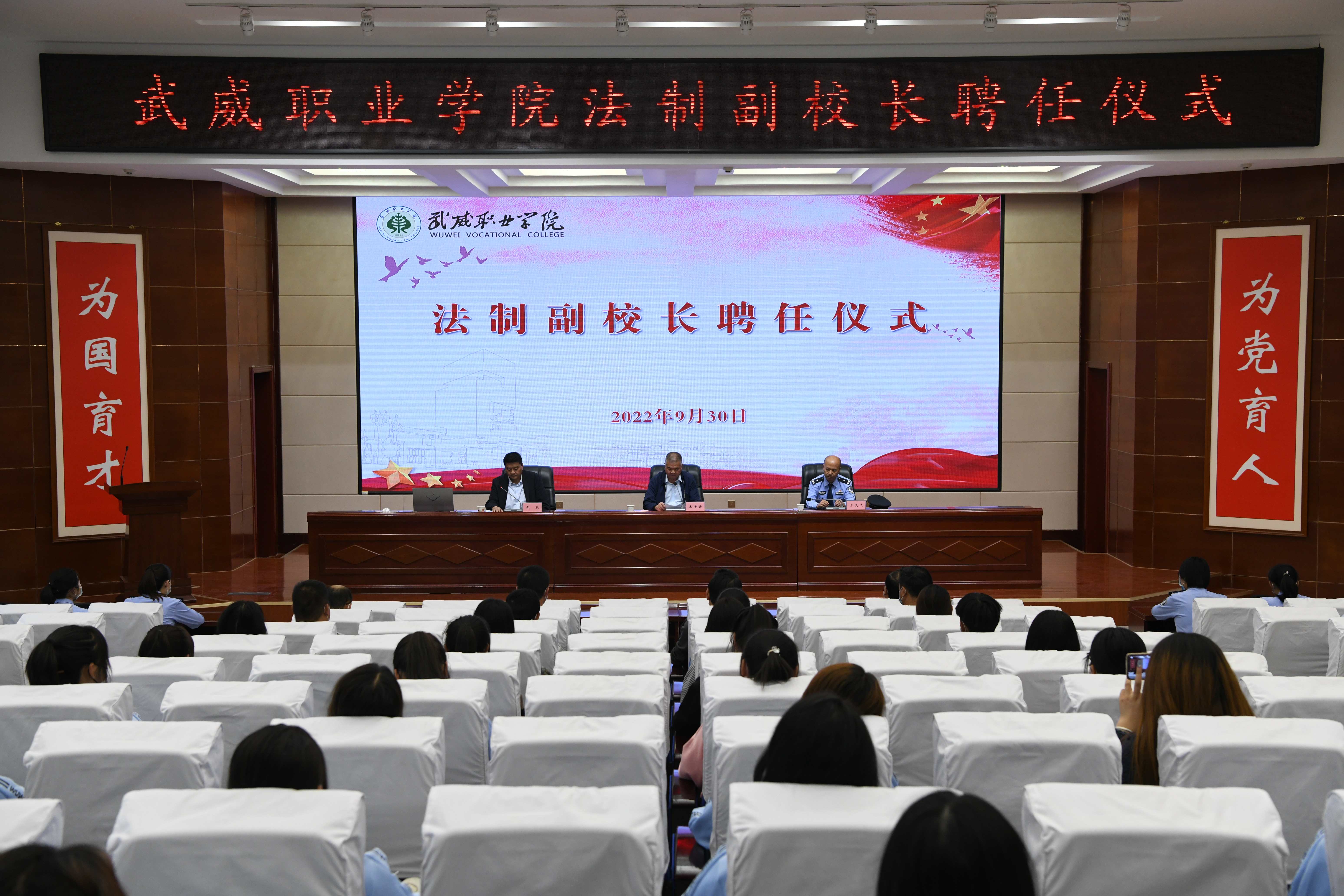 9月30日下午,學(xué)校在學(xué)生發(fā)展中心菁英廳舉行法制副校長(zhǎng)聘任儀式,武威市涼州區(qū)公安局西關(guān)派出所所長(zhǎng)于文達(dá)、西關(guān)派出所民警代表,學(xué)校相關(guān)部門(mén)、各二級(jí)學(xué)院負(fù)責(zé)人及師生代表參加了聘任儀式,學(xué)校黨委委員、副校長(zhǎng)王守云出席了儀式,儀式由學(xué)校安全保衛(wèi)處負(fù)責(zé)人李欣主持。