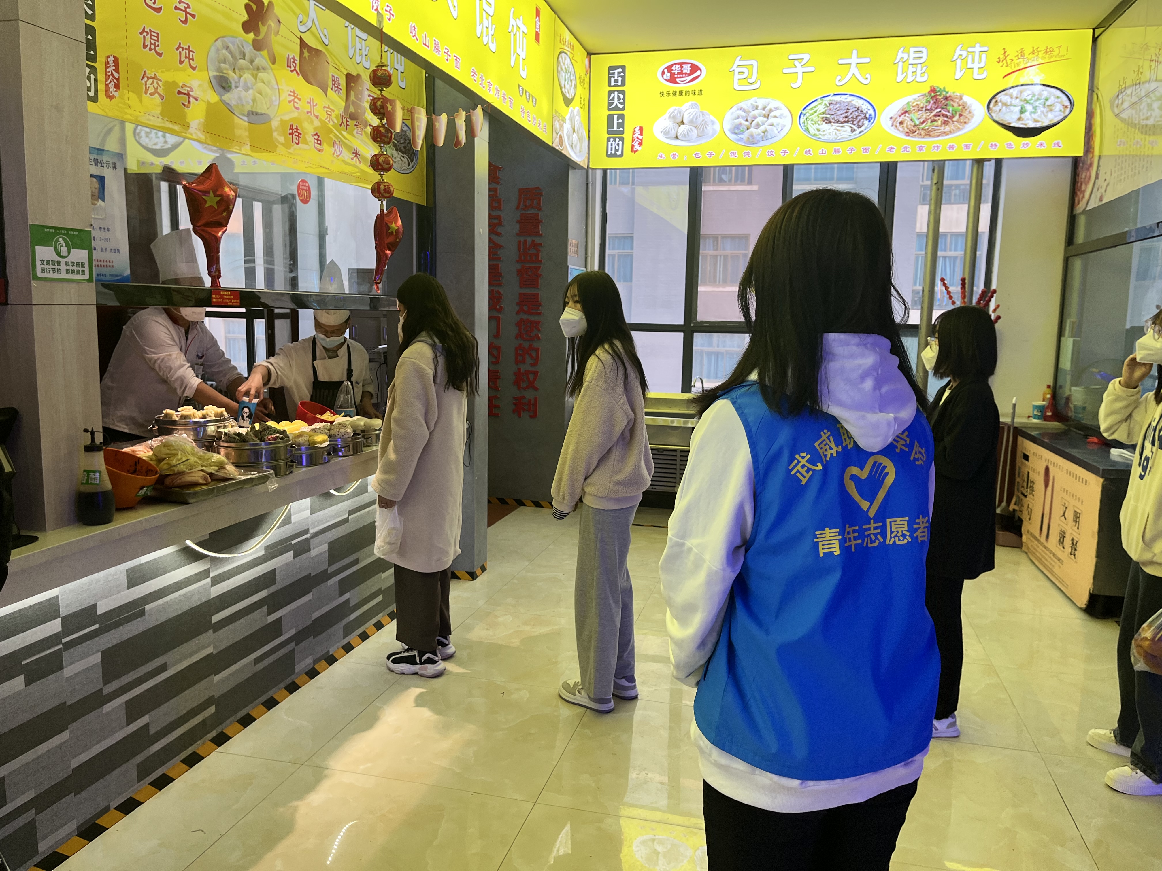 從學(xué)校實(shí)行最小單元宿舍管理開始,各學(xué)生組織工作人員分批次、不間斷、輪流值守,他們主動(dòng)亮身份、帶頭當(dāng)先鋒,在校園食堂、水房、超市等人流容易聚集的地方,每天安排志愿者在人流高峰時(shí)間段排班站崗,勸導(dǎo)同學(xué)們遵守疫情防控一米線,不扎堆不聚集,積極佩戴好口罩,做好個(gè)人防護(hù)工作,確保同學(xué)們吃飯、購(gòu)物、打水健康有序進(jìn)行。在對(duì)可能傳入疫情的校園圍欄處開展值守勸阻工作,積極勸導(dǎo)學(xué)生不購(gòu)買社會(huì)面商品,堅(jiān)決杜絕疫情從社會(huì)傳入校園,將學(xué)校疫情防控各項(xiàng)措施落細(xì)落實(shí),切實(shí)扛起校園疫情防控責(zé)任。一件件“藍(lán)馬甲”活躍在校園每個(gè)角落,服務(wù)同學(xué)的身影從未間斷,成為校園里一道靚麗的風(fēng)景線,用實(shí)際行動(dòng)詮釋了新時(shí)代武職學(xué)子的責(zé)任與擔(dān)當(dāng)。