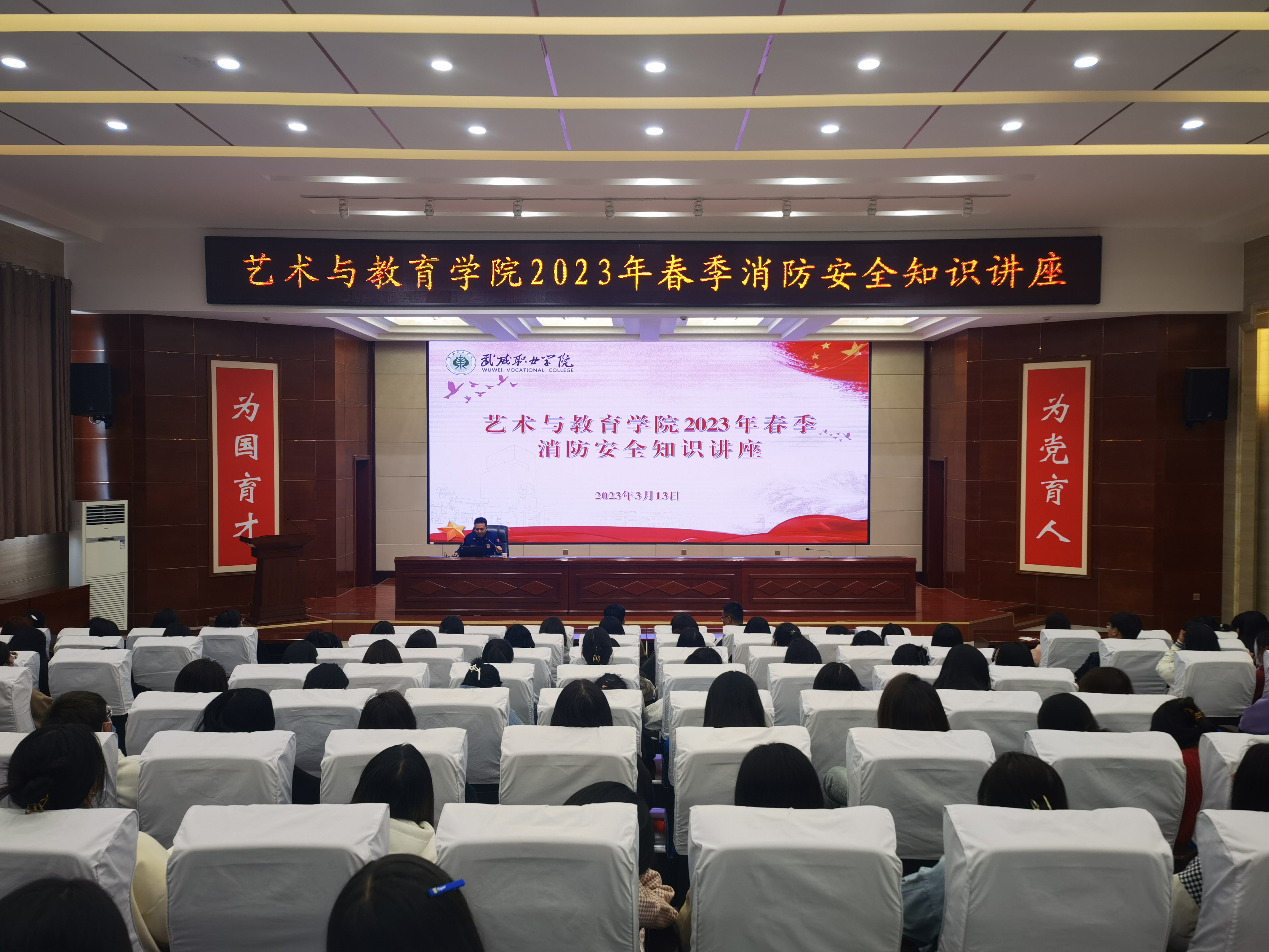 為進(jìn)一步加強(qiáng)我院師生消防安全意識,提升自我應(yīng)變和防護(hù)能力。近日,藝術(shù)與教育學(xué)院在大學(xué)生發(fā)展中心菁英廳開展了消防安全知識講座。講座由武威市消防救援支隊(duì)涼都特勤站站長武子奇主講,200多名師生參加講座。