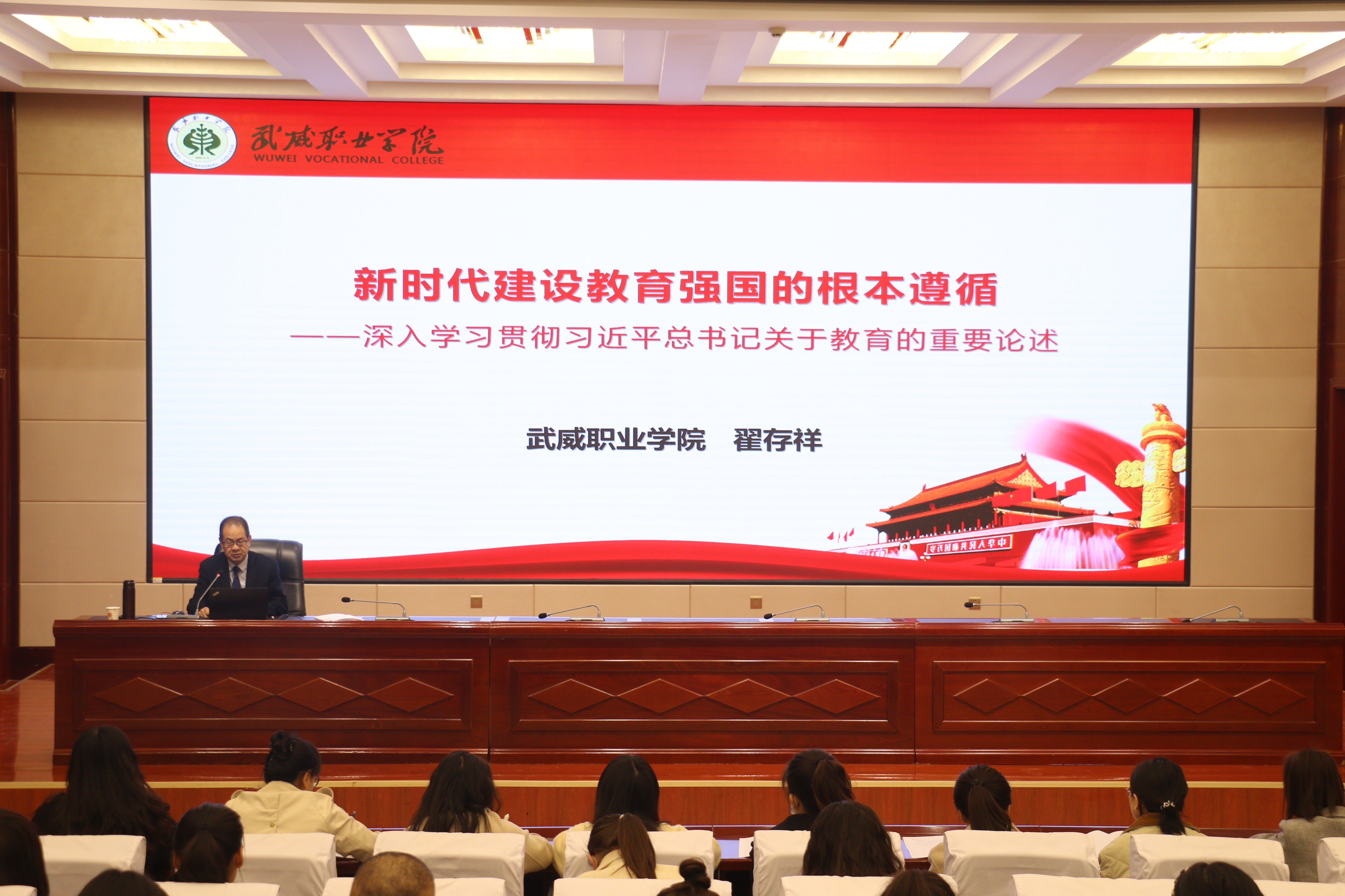 翟存祥代表全體師生對113名新教師成為武威職業(yè)學(xué)院大家庭的一員表示熱烈歡迎,并介紹了舉辦此次培訓(xùn)班的目的。他指出,百年大計,教育為本;教育大計,教師為本;教師大計,師德為本。作為新時代的教師,不要辜負習(xí)近平總書記“奮斗創(chuàng)造奇跡、力量源于團結(jié)、希望寄予青年”的殷切希望。同時,他要求新教師要搞清楚“我是誰,從哪里來,到哪里去”;搞清楚我要“干什么、如何干、為誰干”。盡快站穩(wěn)三尺講臺,盡快融入職業(yè)教育,盡快融入這個大家庭,盡快成長為一名合格的、優(yōu)秀的人民教師,在教育教學(xué)崗位上立德立功立言。