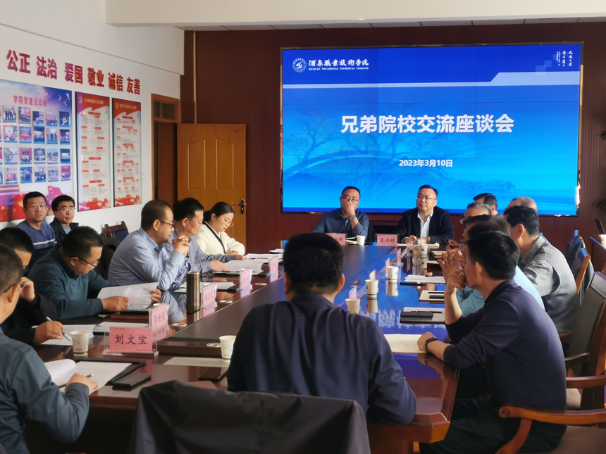 在行知樓會(huì)議室召開交流座談會(huì)。座談會(huì)上,許軍詳細(xì)介紹了酒泉職業(yè)技術(shù)學(xué)院發(fā)展的辦學(xué)特色、專業(yè)建設(shè)、“雙高計(jì)劃”項(xiàng)目建設(shè)和申辦本科層次職業(yè)技術(shù)大學(xué)等情況。翟存祥介紹了武威職業(yè)學(xué)院“雙高計(jì)劃”項(xiàng)目建設(shè)和申辦職業(yè)技術(shù)大學(xué)進(jìn)展。雙方就“雙高計(jì)劃”項(xiàng)目建設(shè)中遇到的堵點(diǎn)、痛點(diǎn)、難點(diǎn)問題和本科層次職業(yè)學(xué)校申辦、高水平專業(yè)群打造、“三教”改革、科研平臺(tái)搭建、社會(huì)服務(wù)能力提升、產(chǎn)業(yè)學(xué)院體制與管理、國際合作交流等工作進(jìn)行了深入探討交流。