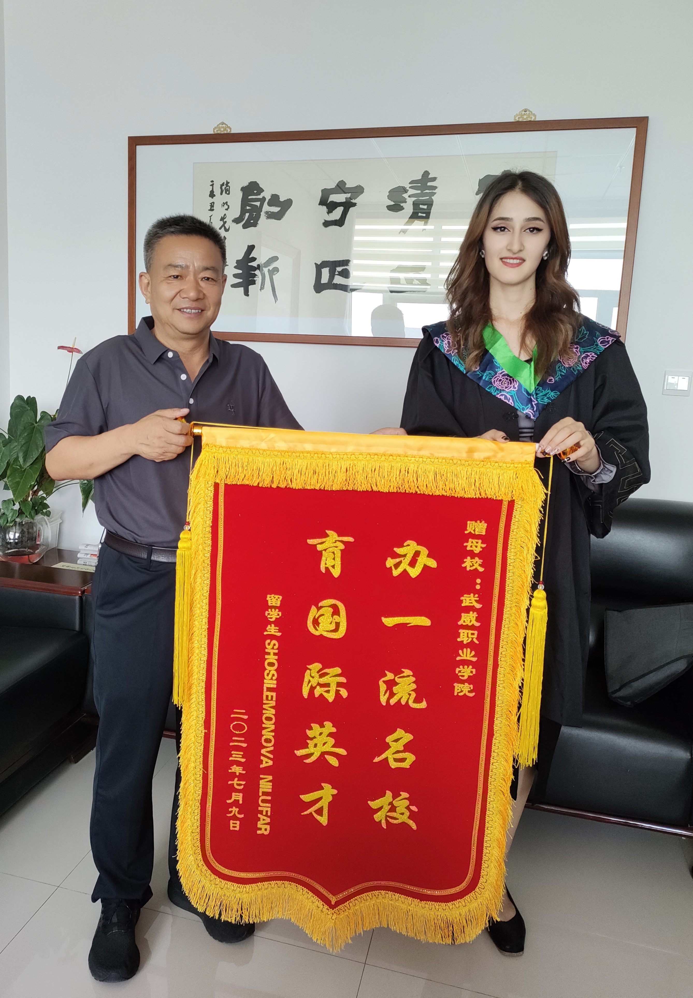 國(guó)際學(xué)生HOSILEMONOVA NILUFAR(妮娜)向?qū)W校贈(zèng)送“辦一流名校 育國(guó)際英才”的感謝旌旗,對(duì)學(xué)校精心、悉心培養(yǎng)自己表達(dá)了由衷的感謝,表示在武威職業(yè)學(xué)院收獲了專業(yè)技能和人生閱歷,接觸到了先進(jìn)技術(shù)技能和前沿思想,特別是通過(guò)學(xué)習(xí)中國(guó)文化,深刻認(rèn)識(shí)到文化交流的重要性,也更加堅(jiān)定了自己繼續(xù)學(xué)習(xí)中文和中國(guó)文化的決心。