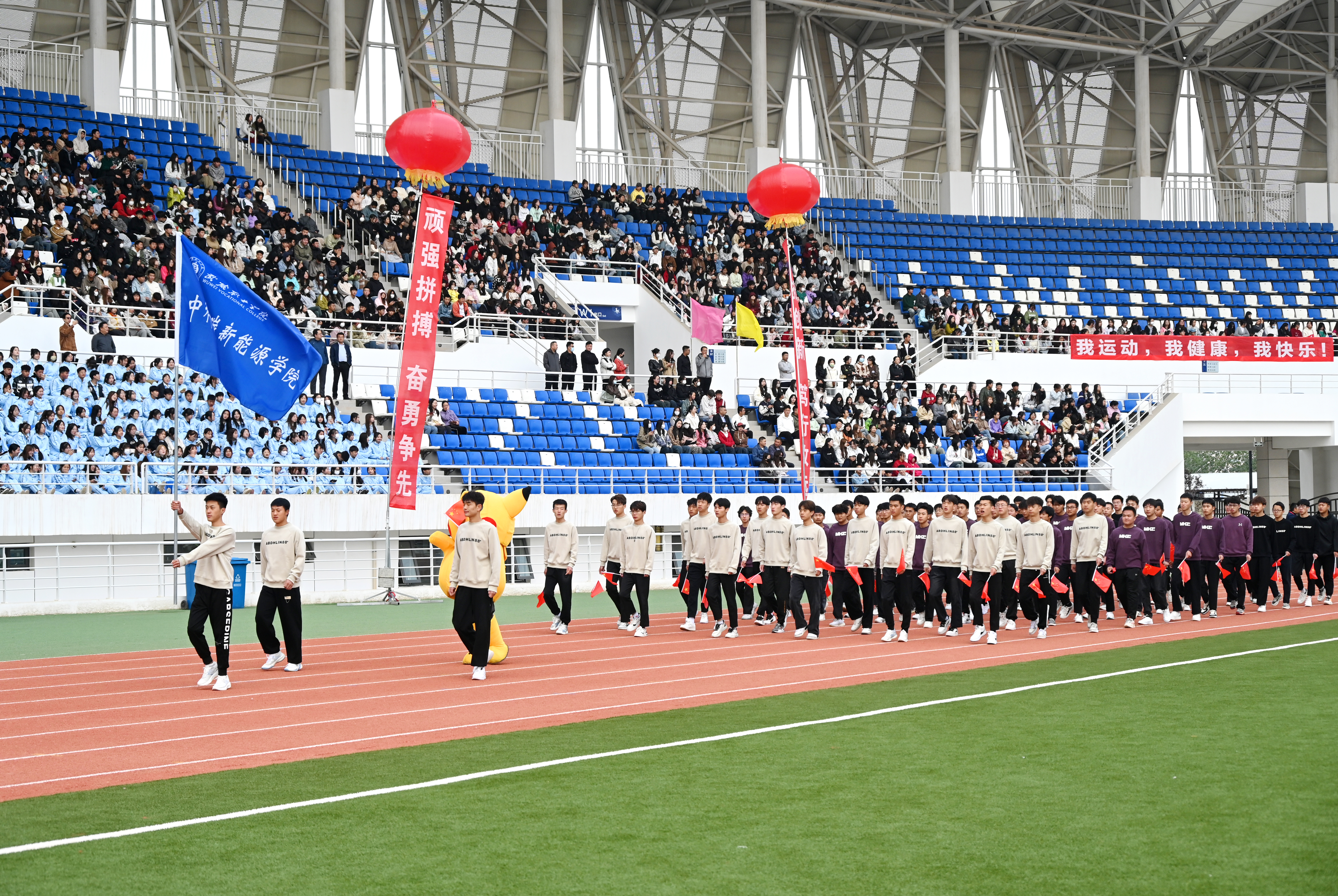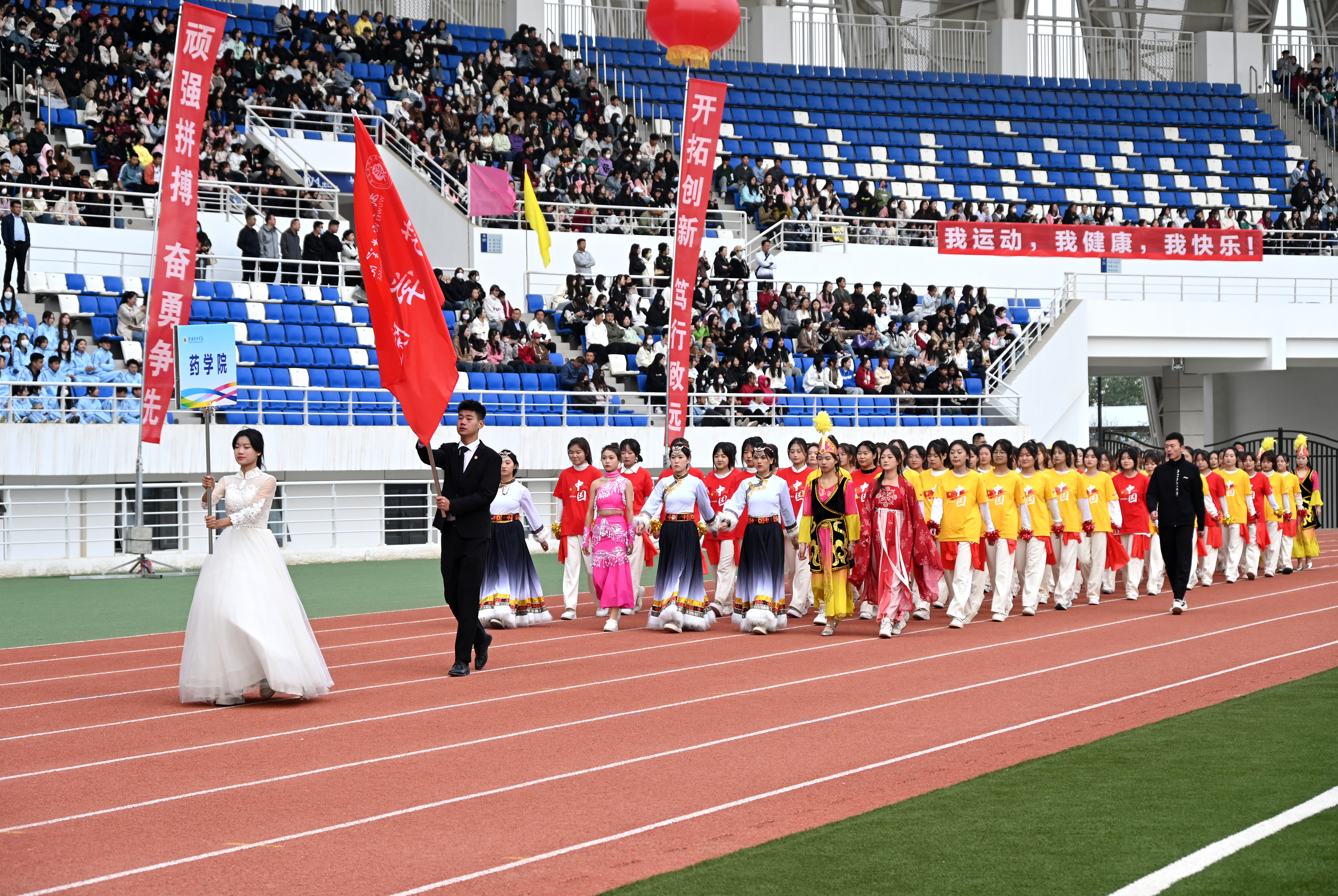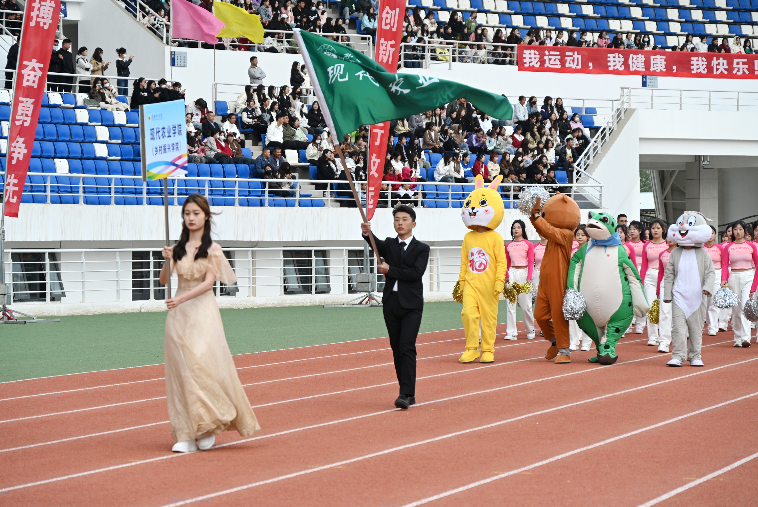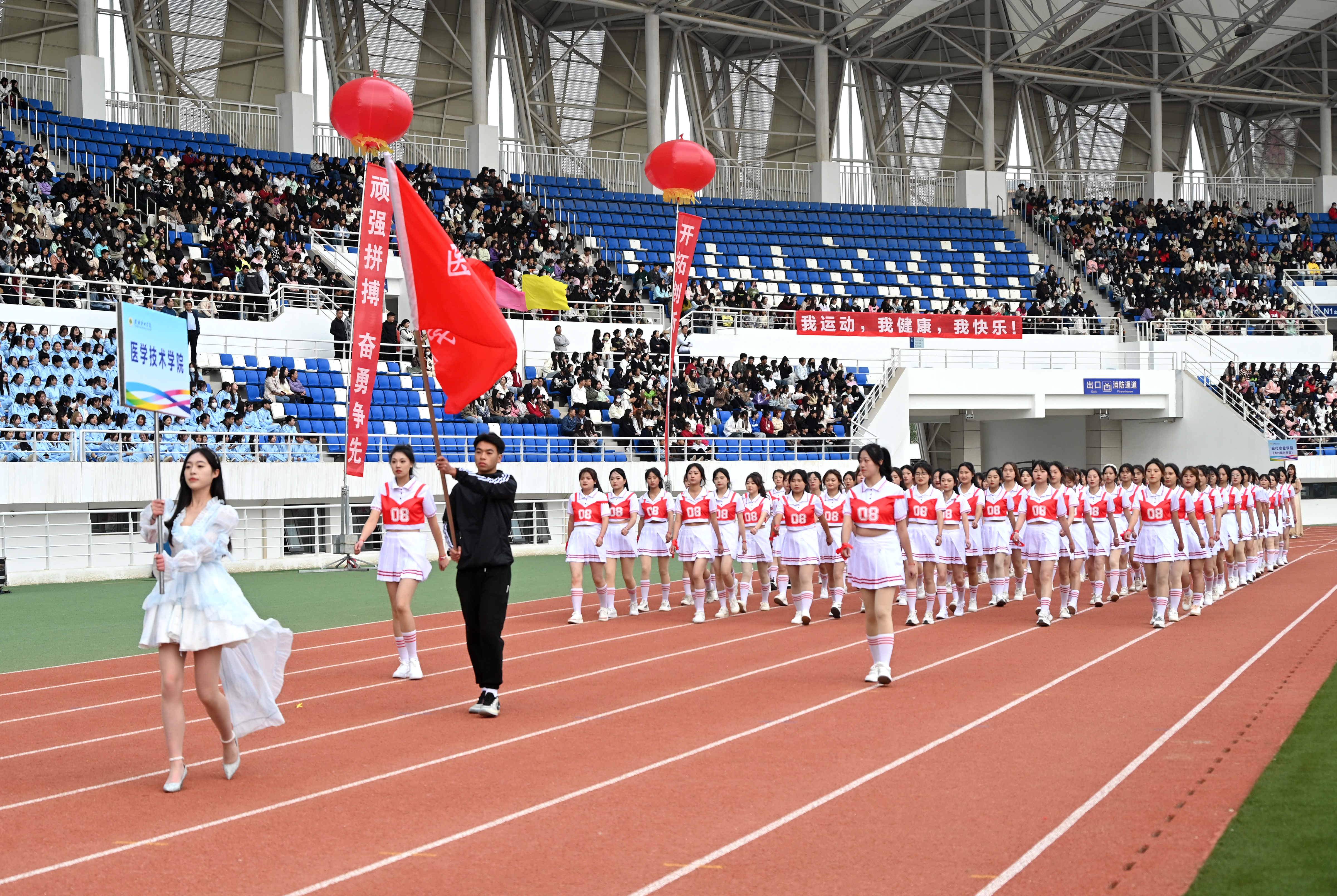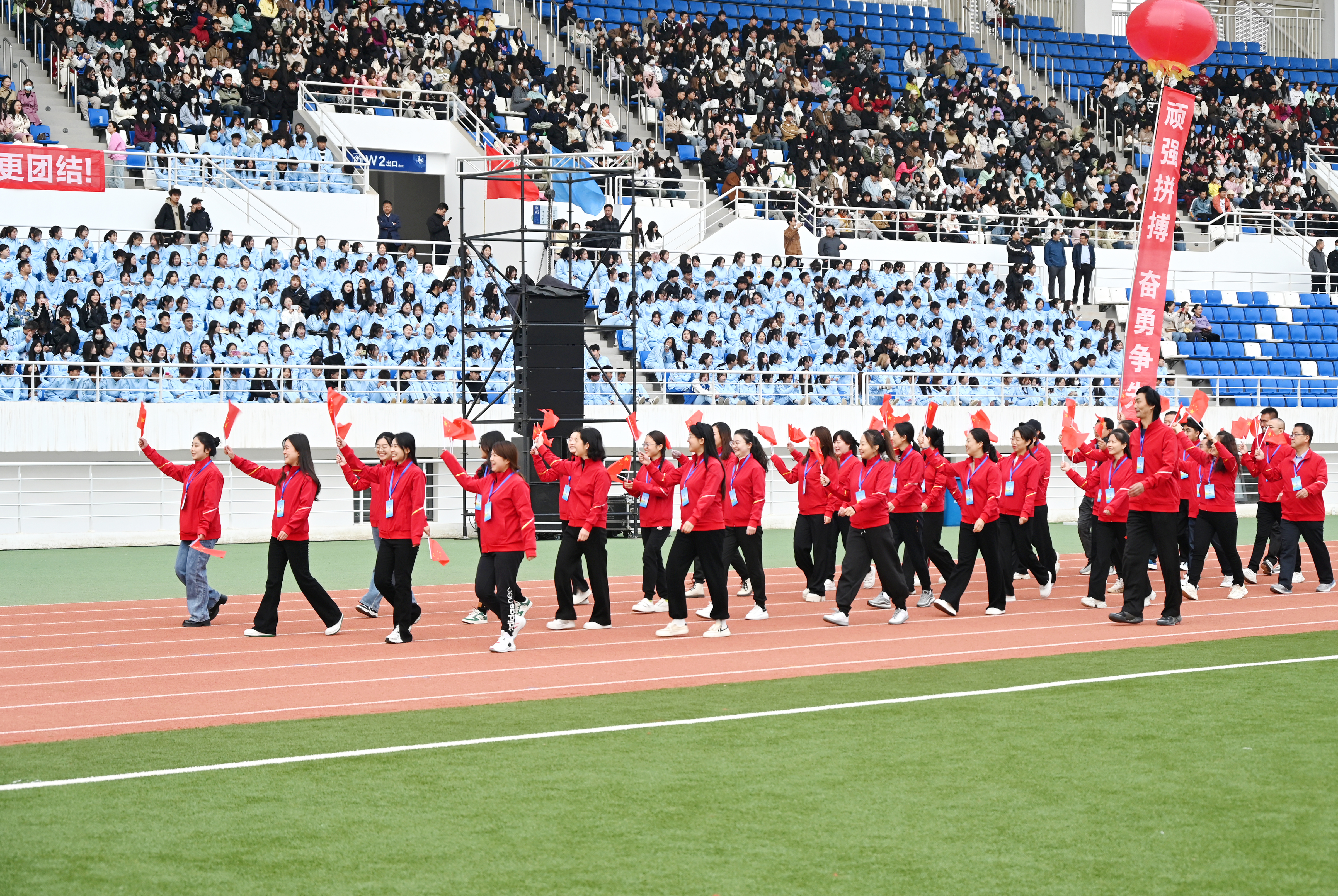 伴隨著雄壯激越的運動員進行曲,國旗護衛(wèi)隊、彩旗隊、裁判員隊伍、各二級學(xué)院方陣依次入場,隊列步伐整齊有力,口號堅定嘹亮,充分展示了師生良好的精神風貌。