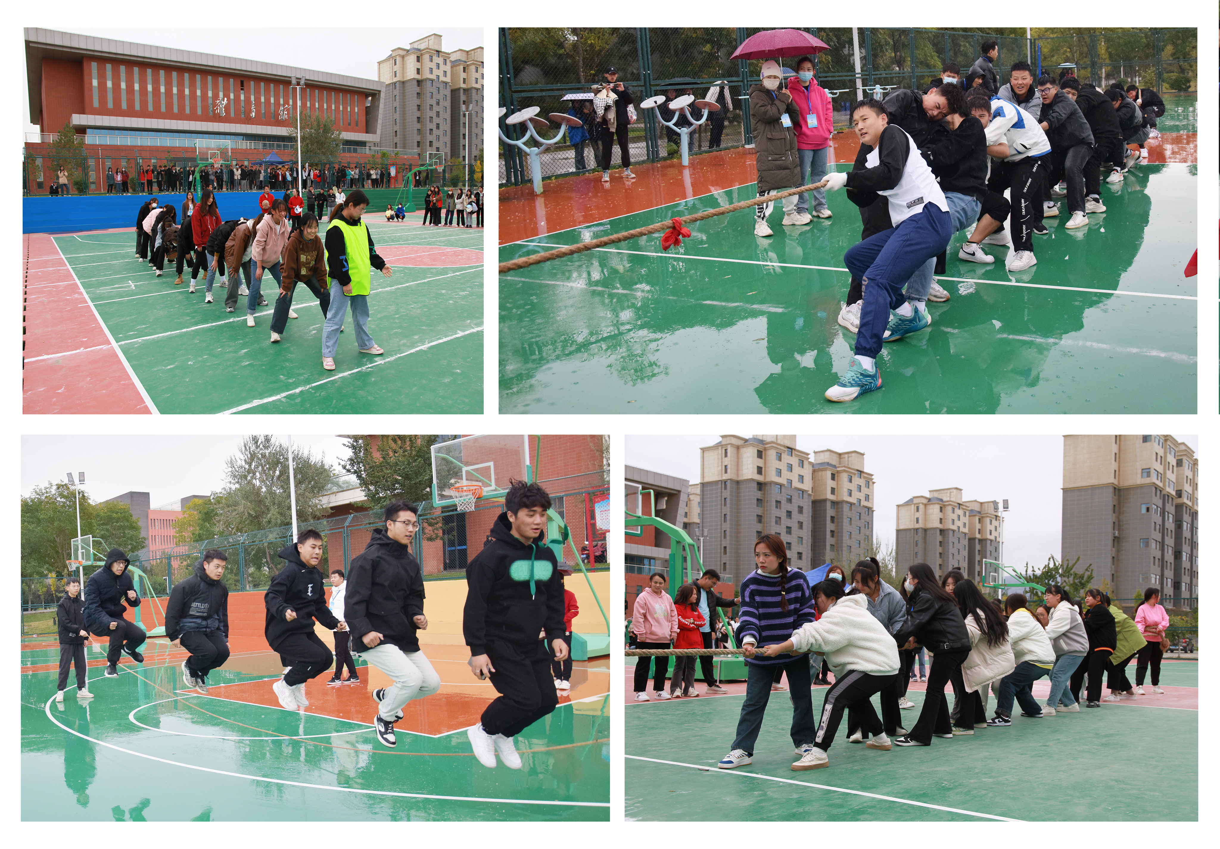比賽場上,運動員們不畏風雨、奮勇拼搏、超越自我。觀眾席上,同學(xué)們用熱情的掌聲、歡呼聲向運動員加油助威。