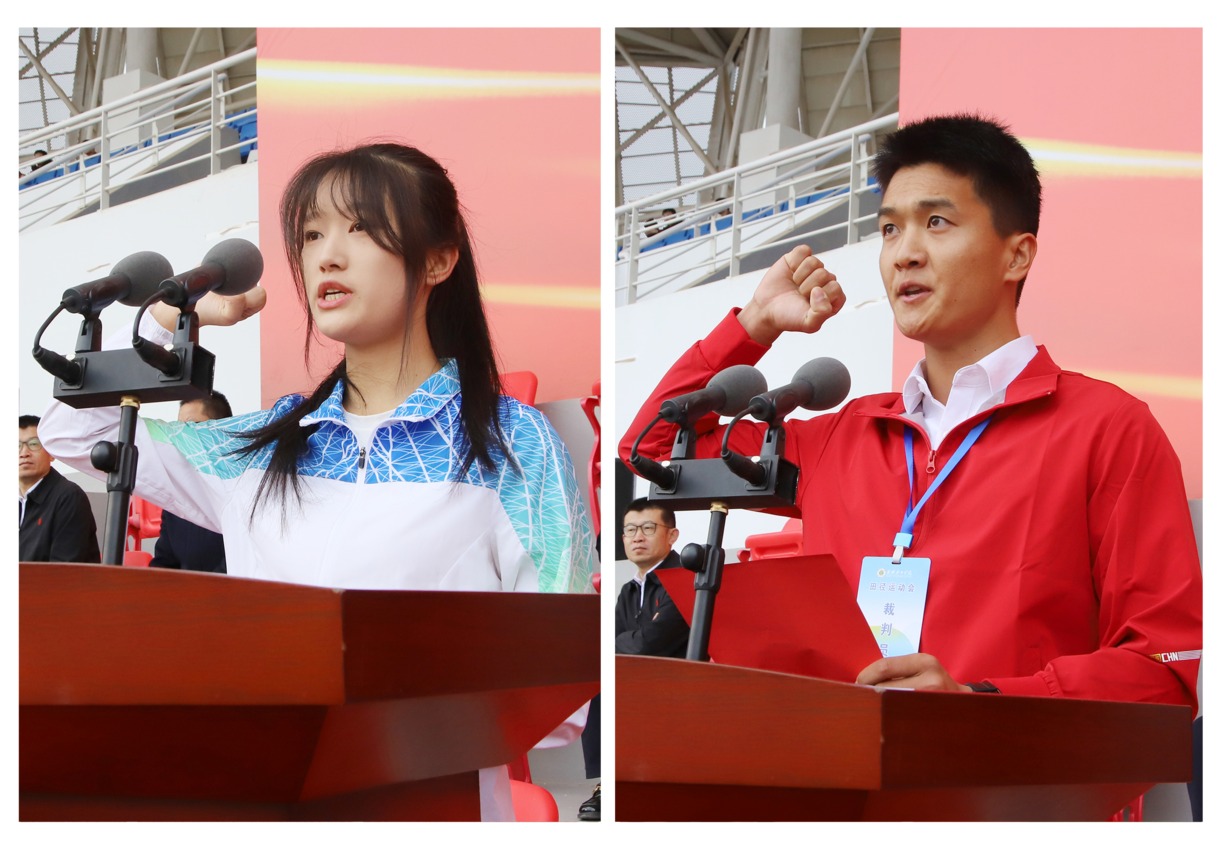 開幕式上,侯昊燁同學(xué)和吳績?nèi)鹄蠋煼謩e代表運動員和裁判員進行了莊嚴的宣誓。